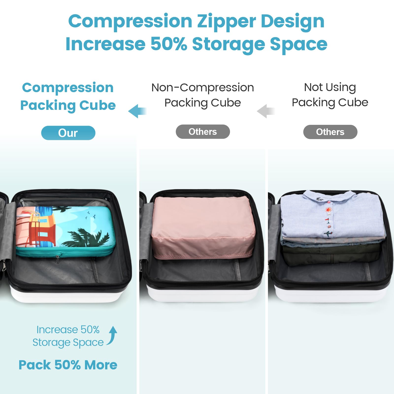 - Pack More in Less Space: The compression design increase 50% storage space, helping you pack more items in the suitcase and avoid additional luggage fees. In addition, our packing cubes for travel compression reduces movement between garments, and helps reduce wrinkles