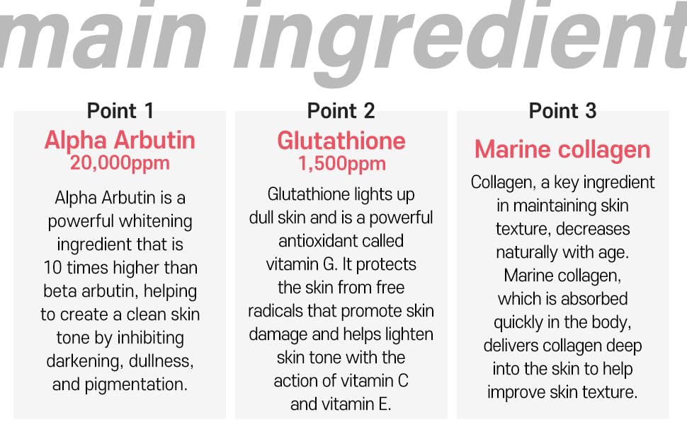 - Brightens and evens skin tone: Powerful combination of alpha arbutin 20,000ppm, glutathione 1,500ppm, and marine collagen to target dark spots, freckles, and uneven skin tone.