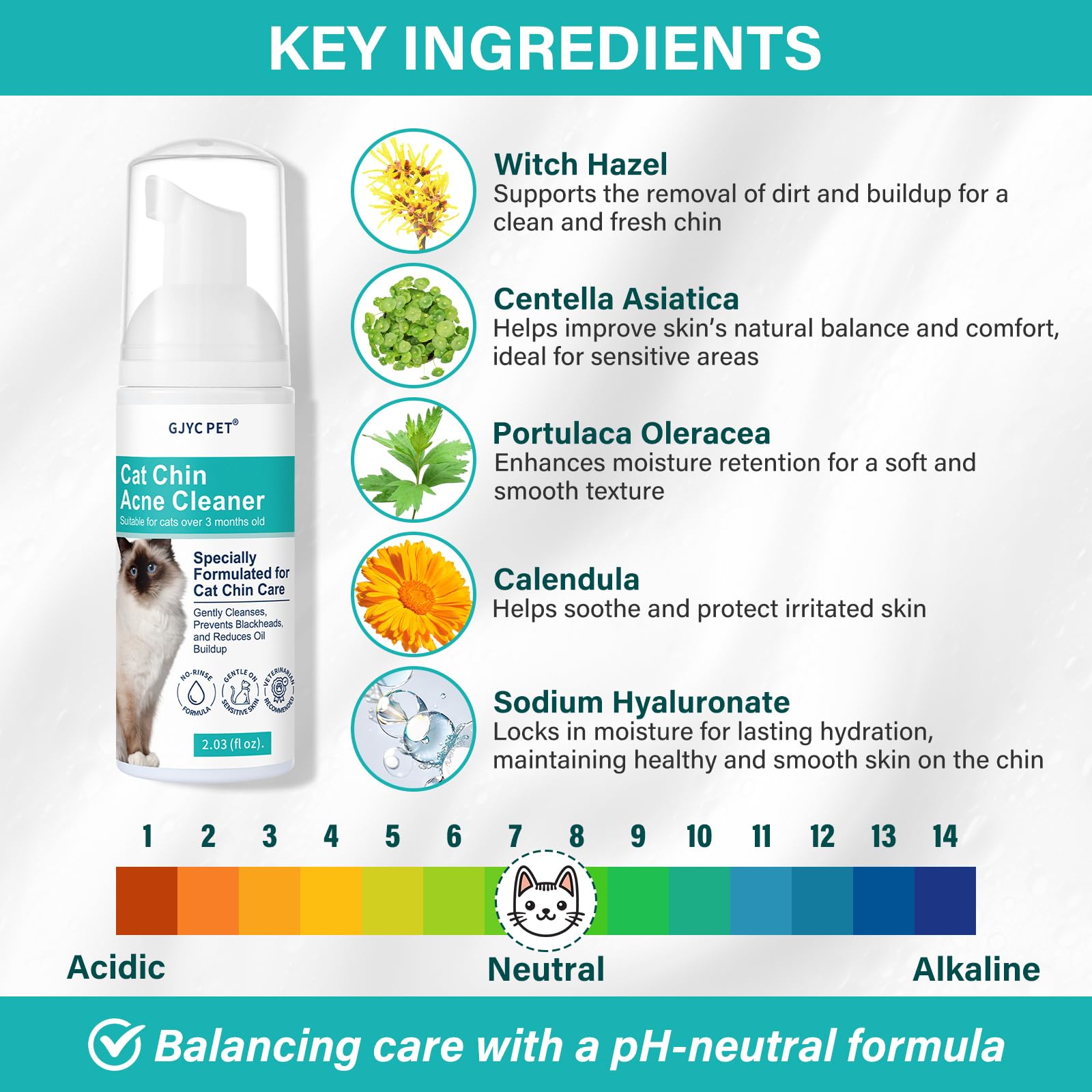 - Natural Soothing: Specially enriched with Centella Asiatica, Chamomile, and Witch Hazel Extracts, this formula ensures effective cleansing while soothing and calming your cat's skin;
