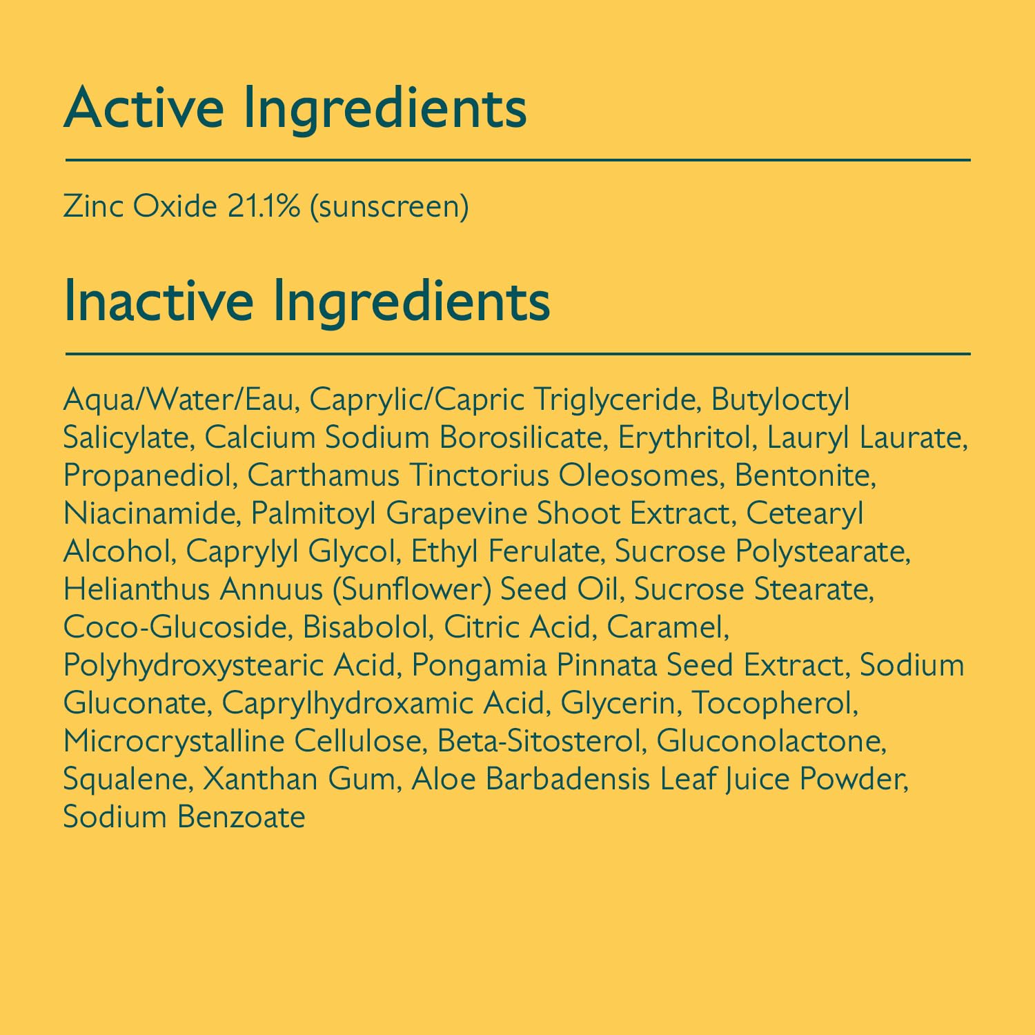 - MINERAL FACE SUNSCREEN: When using a mineral filter like zinc oxide to reach a high SPF 50 coverage, a white cast can occur and is more noticeable on deeper skin tones. This is due to the weight and thickness of the filter for sun protection. For best use, shake the product well, warm the texture, and work the product into your skin.