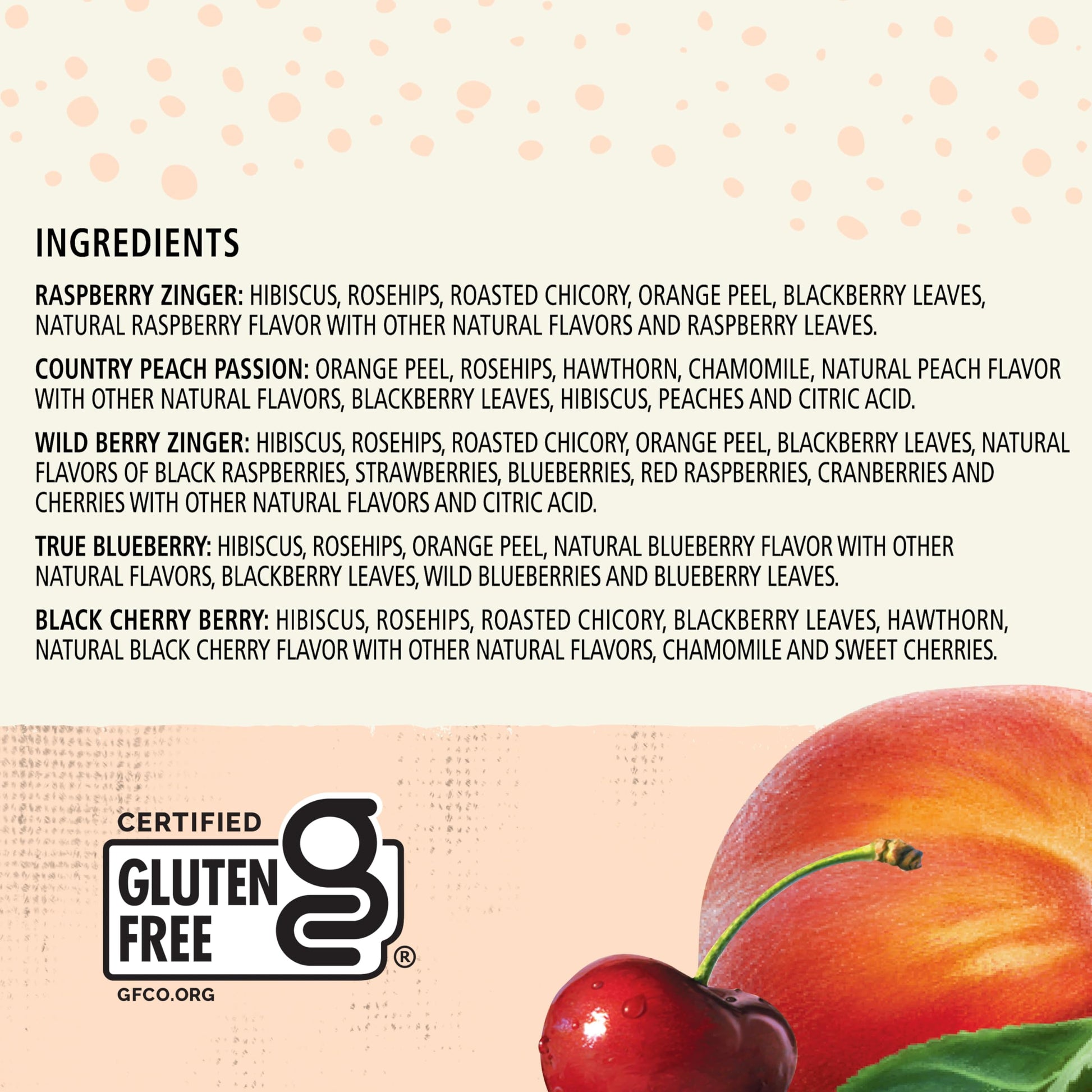 - FRUIT FLAVOR VARIETY: Savor a lively herbal tea variety pack featuring fruit tea bags such as Raspberry Zinger, Country Peach Passion, Wild Berry Zinger, True Blueberry, and Black Cherry Berry