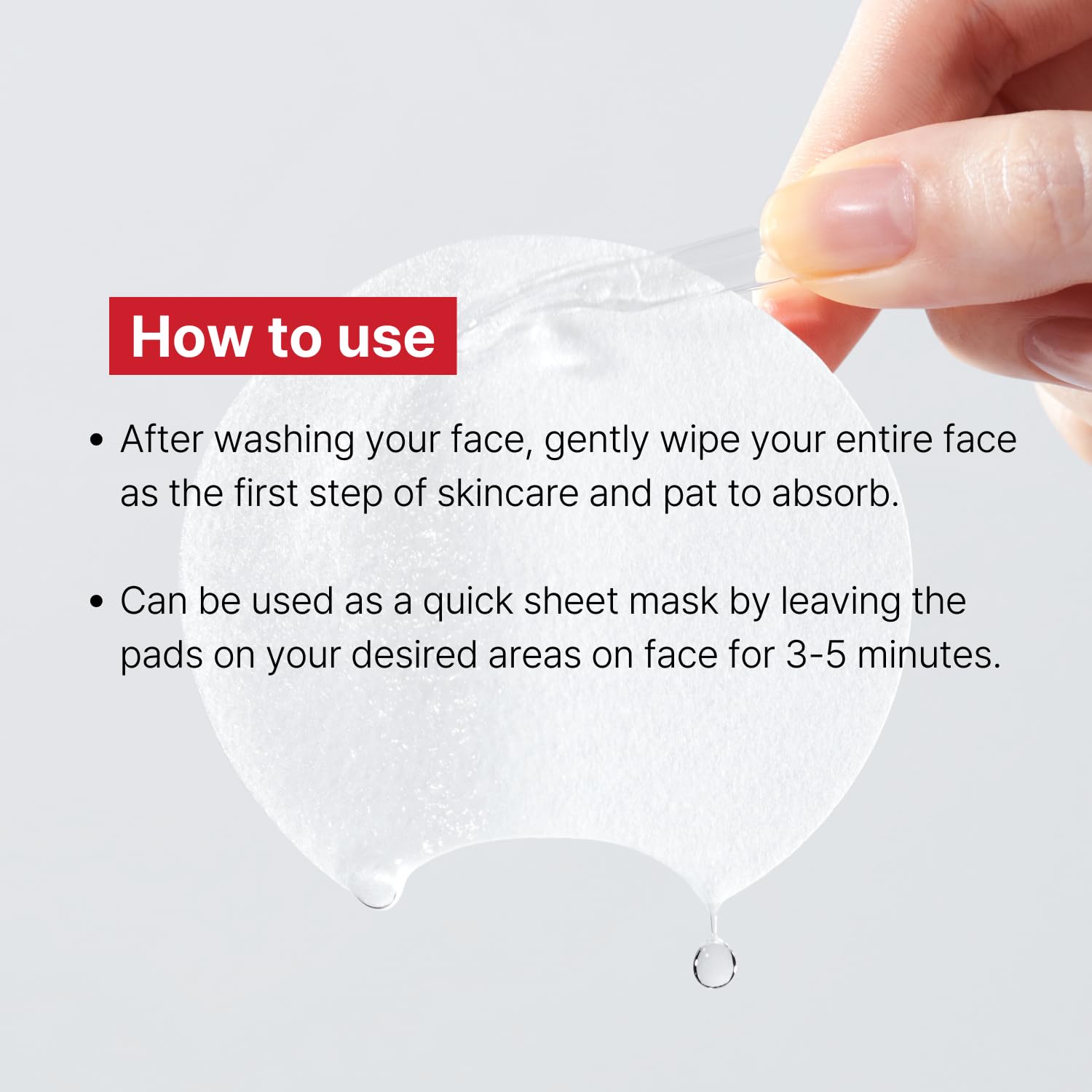- HOW TO USE: After washing your face, gently wipe your entire face as the first step of skincare and pat to absorb. Can be used as a quick sheet mask by leaving the pads on your desired areas on face for 3-5 minutes. Close the lid after use. Avoid using around your eyes.