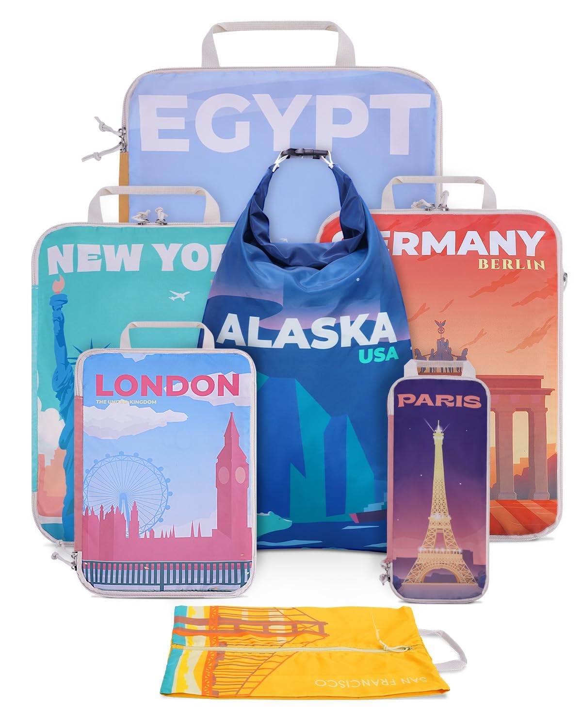 Ceneda 7 Set Compression Packing Cubes for Travel, Expandable Luggage Organizer with Shoe & Laundry Bags, Lightweight Suitcase Packing Cubes for Women & Family, Carry-On, Cruise, Vacation (City Print)