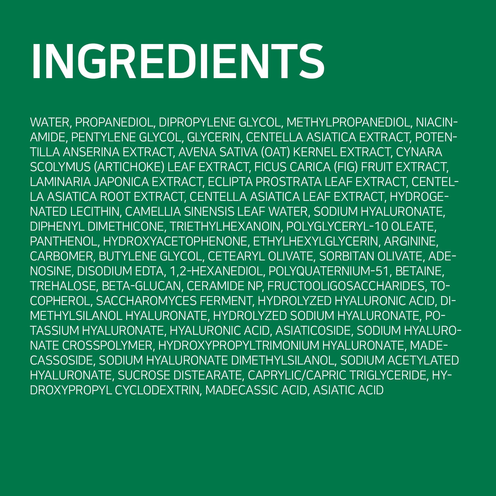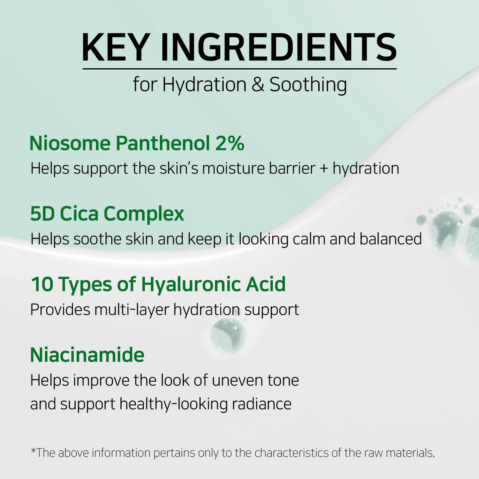 - 5D CICA COMPLEX + 10 TYPES OF HYALURONIC ACID: A blend of 5 Centella-derived ingredients and multi-layer Hyaluronic Acids that help provide soothing care and maintain hydration.