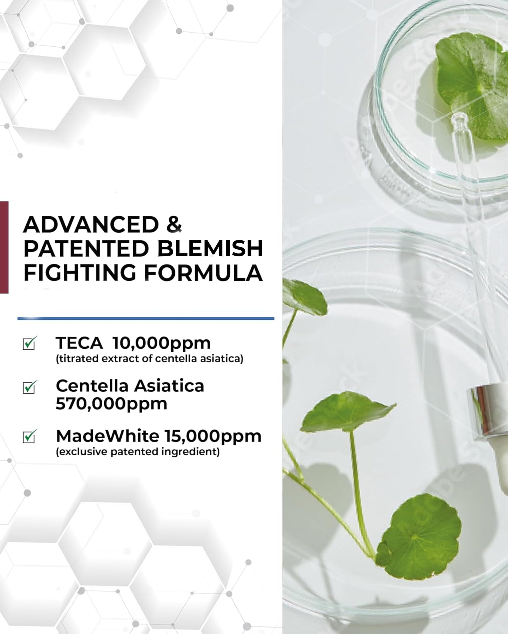 - HIGHLY CONCENTRATED FORMULA - Each bottle features 570,000 ppm of centella asiatica extract, 10,000 ppm of TECA (titrated extract of centella asiatica), the cornerstone of Dongkook Pharmaceutical's technology, and 15,000 ppm of MadeWhite.