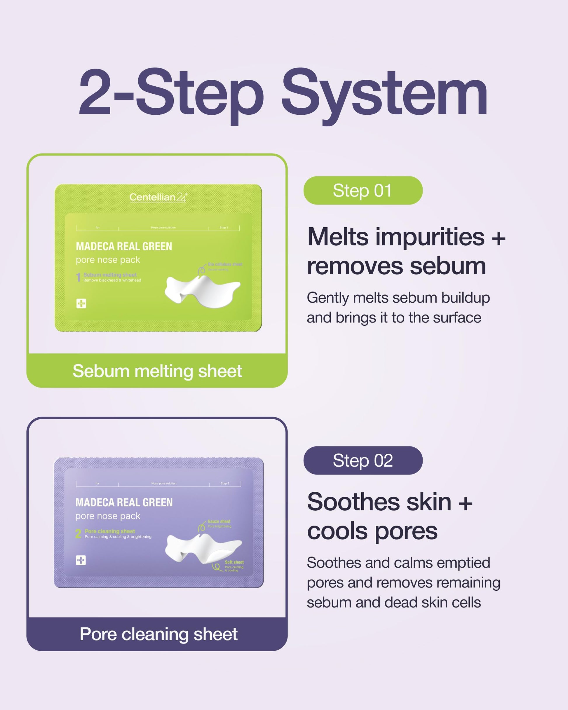 - CENTELLIAN 24 MADECA REAL GREEN PORE NOSE PATCH (0.24fl oz/ Pack of 5) - Deeply cleanses and removes stubborn impurities, blackheads, and excess sebum with a powerful two-step process. Step 1 dissolves buildup, while Step 2 soothes and refreshes the skin, leaving pores visibly minimized and refined.