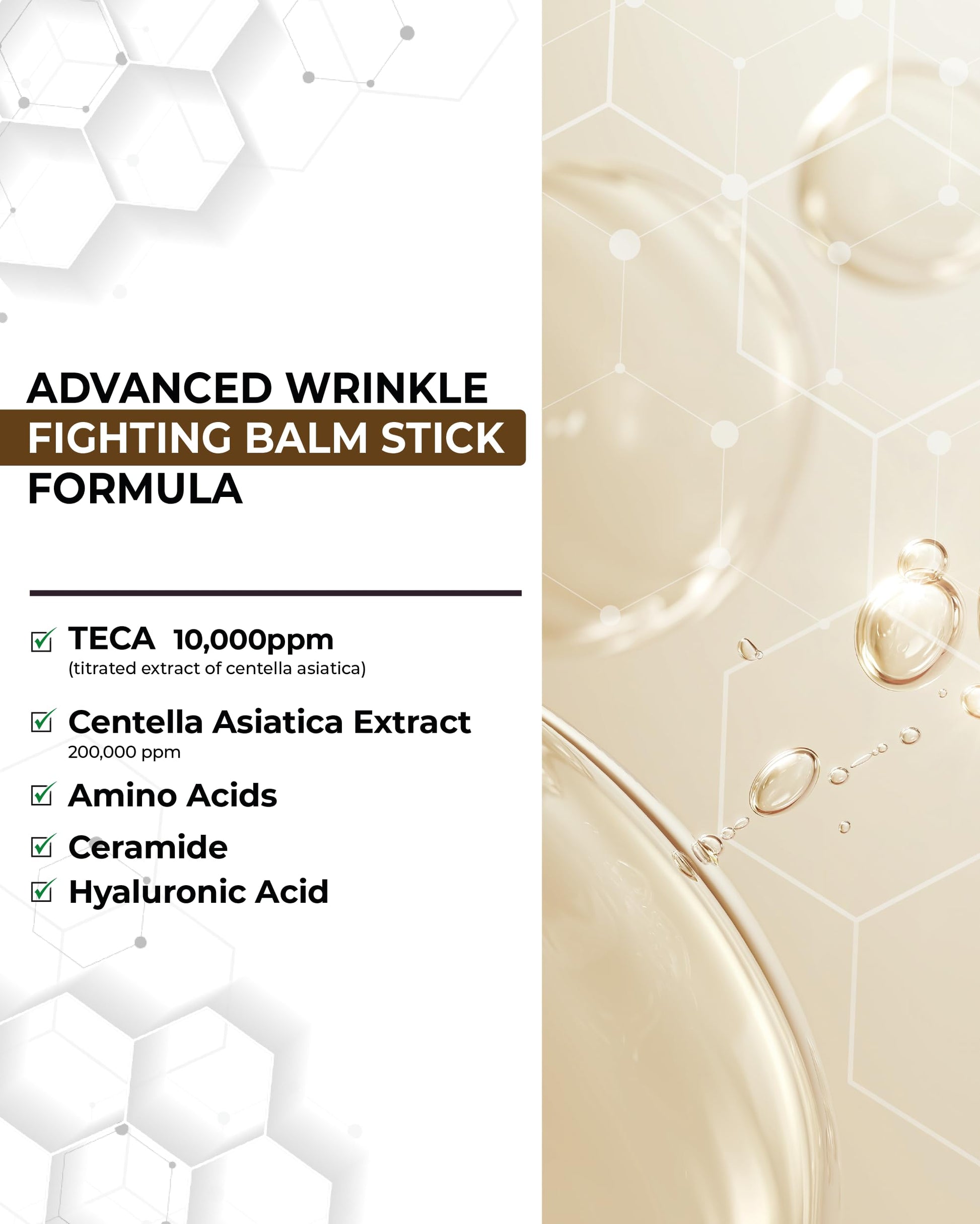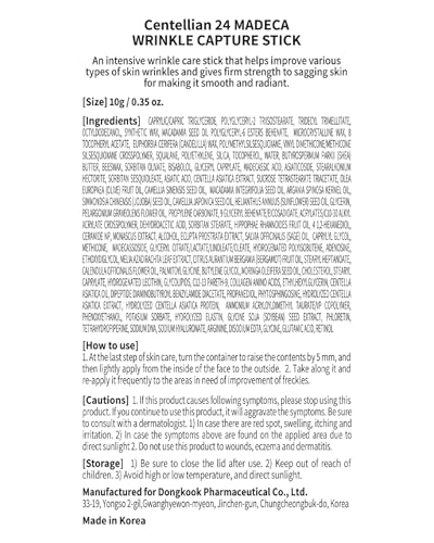 - CENTELLIAN 24 MADECA WRINKLE CAPTURE STICK (10g/0.4oz) - This multi balm stick simplifies your daily wrinkle care routine. Crafted with meticulously selected centella asiatica extract from pristine regions, this stick targets specific areas, including the forehead, eye contours, smile lines, and jaw, promoting a more youthful appearance with a potent blend of TECA (titrated extract of centella asiatica) 10,000 ppm and 200,000 ppm of centella asiatica extract.