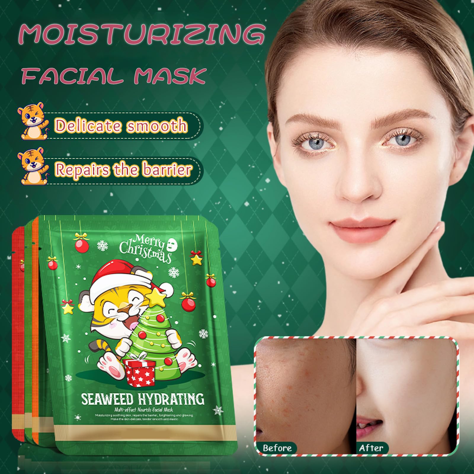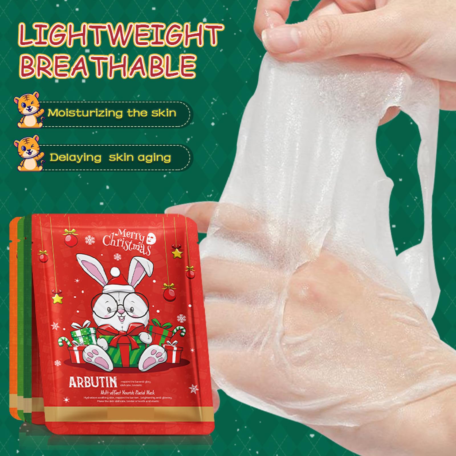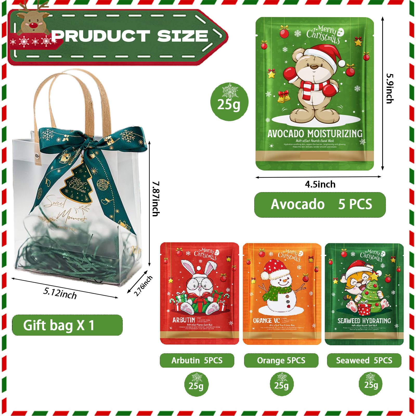 - Convenient Packs: Each facial mask type comes in packs of 5 sheets for multi-use.A sufficient quantity to meet your skincare needs.Paired Christmas packaging bags make it easy for you to give them as favors to anyone.