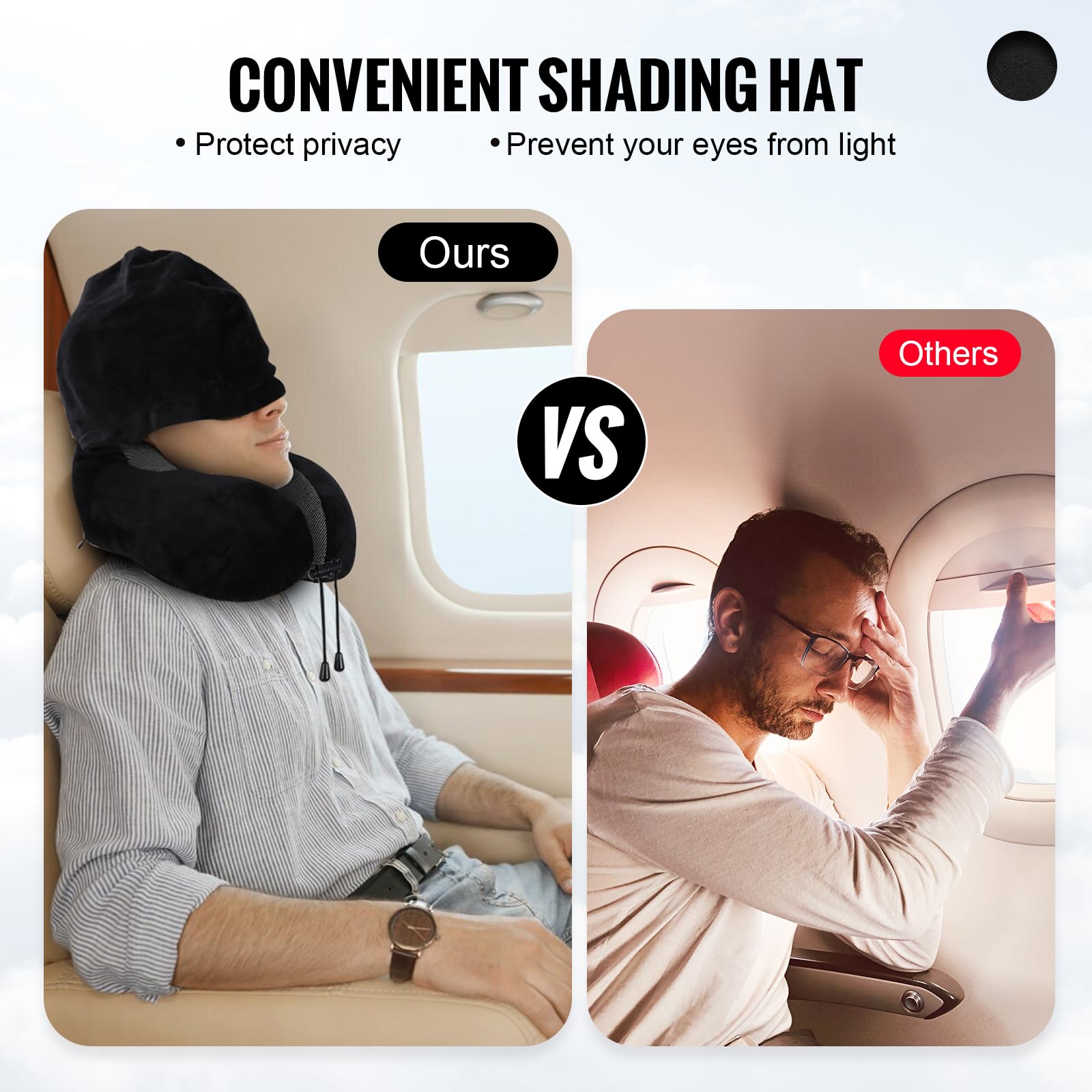 Cirorld Travel Pillow, Neck Pillow for Travel with Hood for Airplane, Velvet Memory Foam Neck Pillow Adult Head & Neck Support, for Long Flights Plane, Office, Cars Sleeping & Rest (Black)