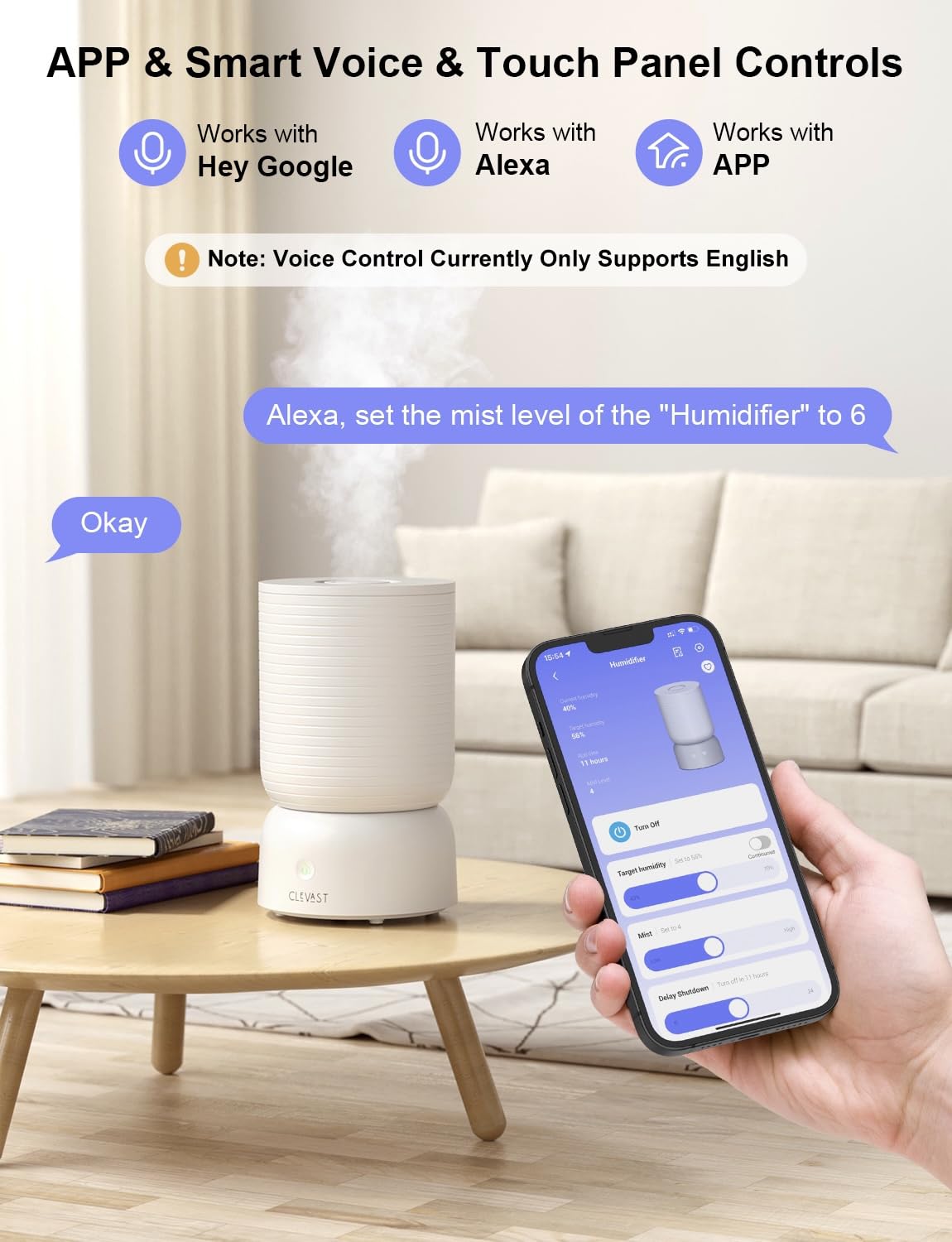 - SMART APP & VOICE & TOUCH CONTROL: Connecting with 2.4GHz Wi-Fi(5G is Not Supported!). Our small humidifier can be controlled through CLEVAST APP from anywhere, you can easily switch it on/off, adjust humidity level & mist intensity , set humidifying timer & schedule, and save your preferred settings. It also works with Alexa, Google Assistant for simple voice control, frees your hands. (ONLY WORKS WITH A 2.4GHz NETWORK)