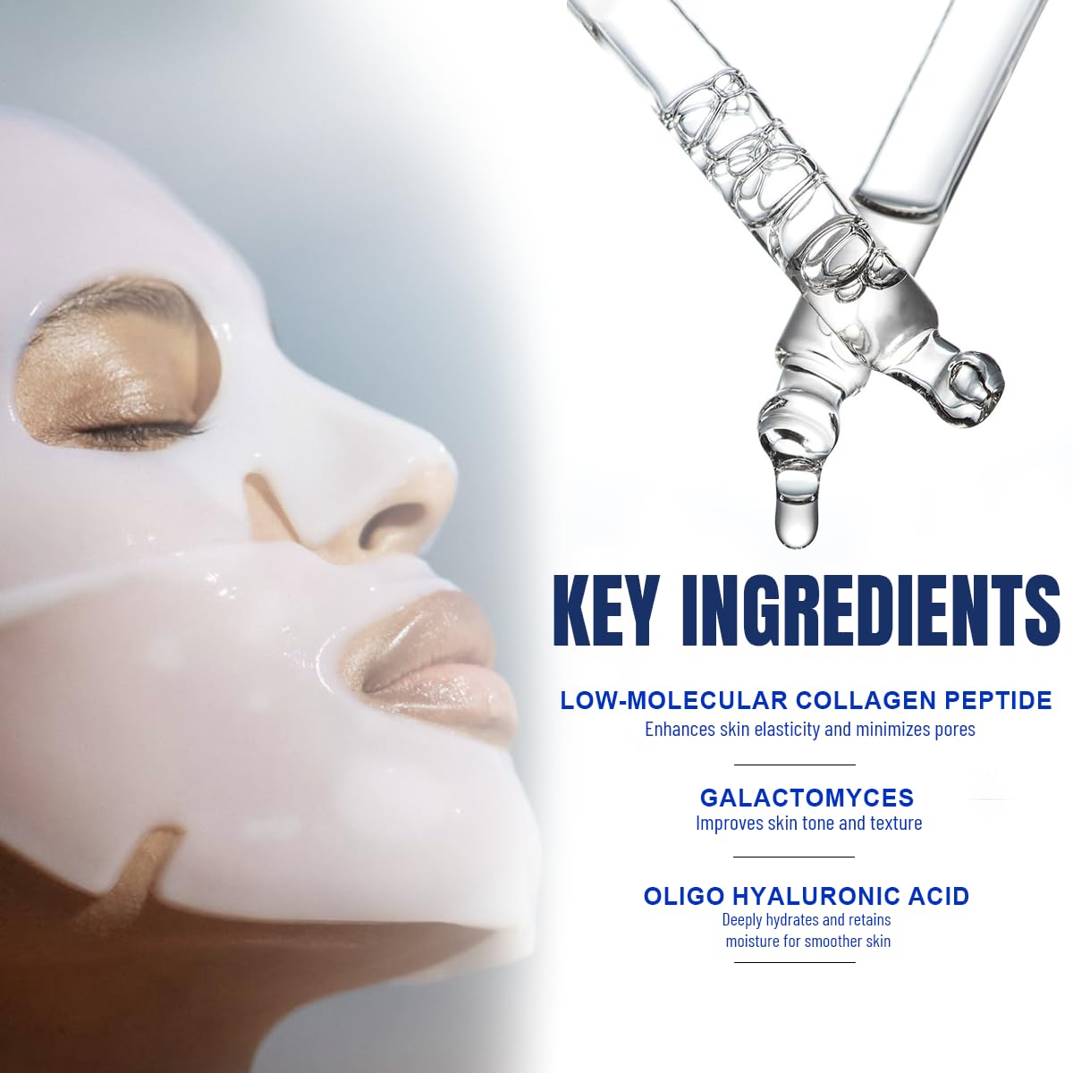 - Pore Tightening & Skin Firming: The ultra-low molecular collagen enhances absorption, helping to tighten enlarged pores while lifting and firming the skin