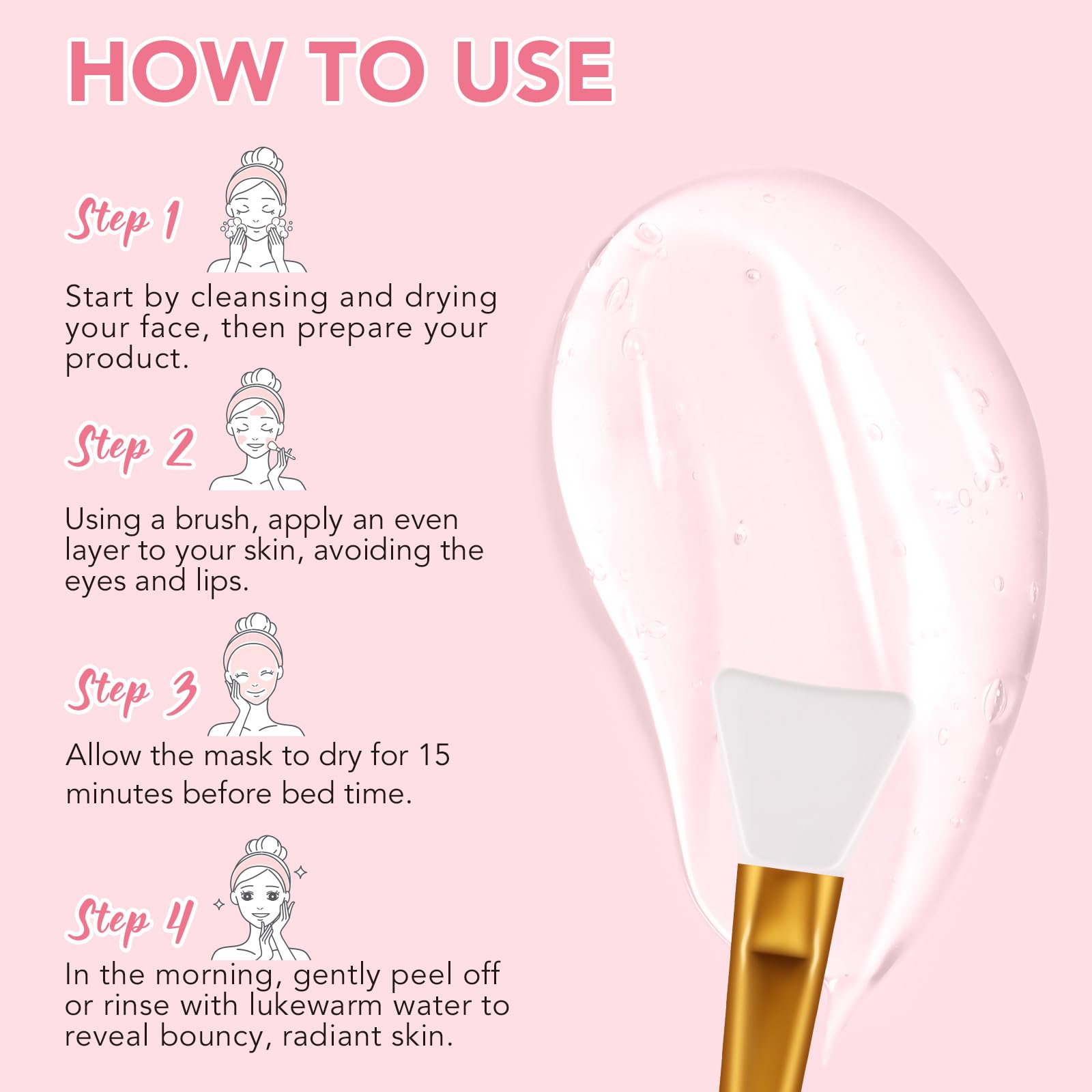 - EASY TO USE - After cleansing, use the included silicone jelly brush to apply it evenly on the face while avoiding the eye and lip areas, wait for 15 minutes until it is completely dry, and then go to bed. Gently peel off the mask or rinse with warm water the next morning.