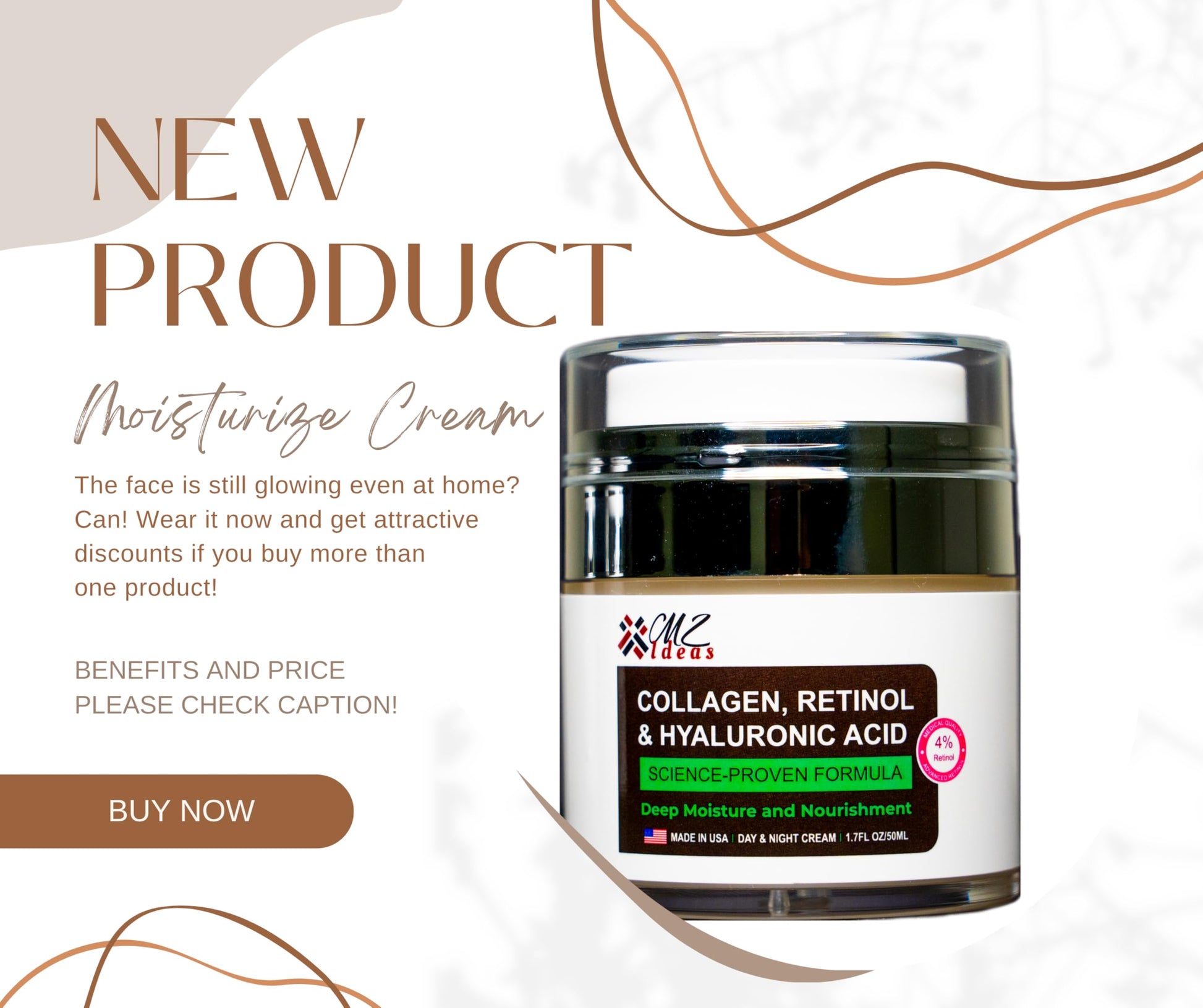 Details: Unlock the secret to radiant, youthful skin with this science-proven formula from MZ Ideas. This luxurious day and night cream combines the power of collagen, retinol, and hyaluronic acid to deliver deep moisture and nourishment to your complexion. The 4% retinol concentration helps diminish the appearance of fine lines and wrinkles, while collagen and hyaluronic acid work in tandem to plump and hydrate for a smoother, more supple look and feel. Made in the USA, this 1.7 fl oz/50ml jar offers a potent blend of age-defying ingredients to reveal your most vibrant, glowing skin. Indulge in this rejuvenating cream and experience the transformative effects of a science-driven skincare solution. Anti-aging cream, Face moisturizer Retinol cream. Hyaluronic acid moisturizer, Wrinkle cream, Night cream. hydraulic acid serum for face. neck firming cream. Rejuvenate & Hydrate Your Skin – Our Collagen, Retinol & Hyaluronic Acid Face Cream deeply nourishes the skin while fighting fine lines, wrinkles, and sagging. Specially designed for the face, neck & décolleté, this anti-aging moisturizer restores elasticity, hydration, and firmness