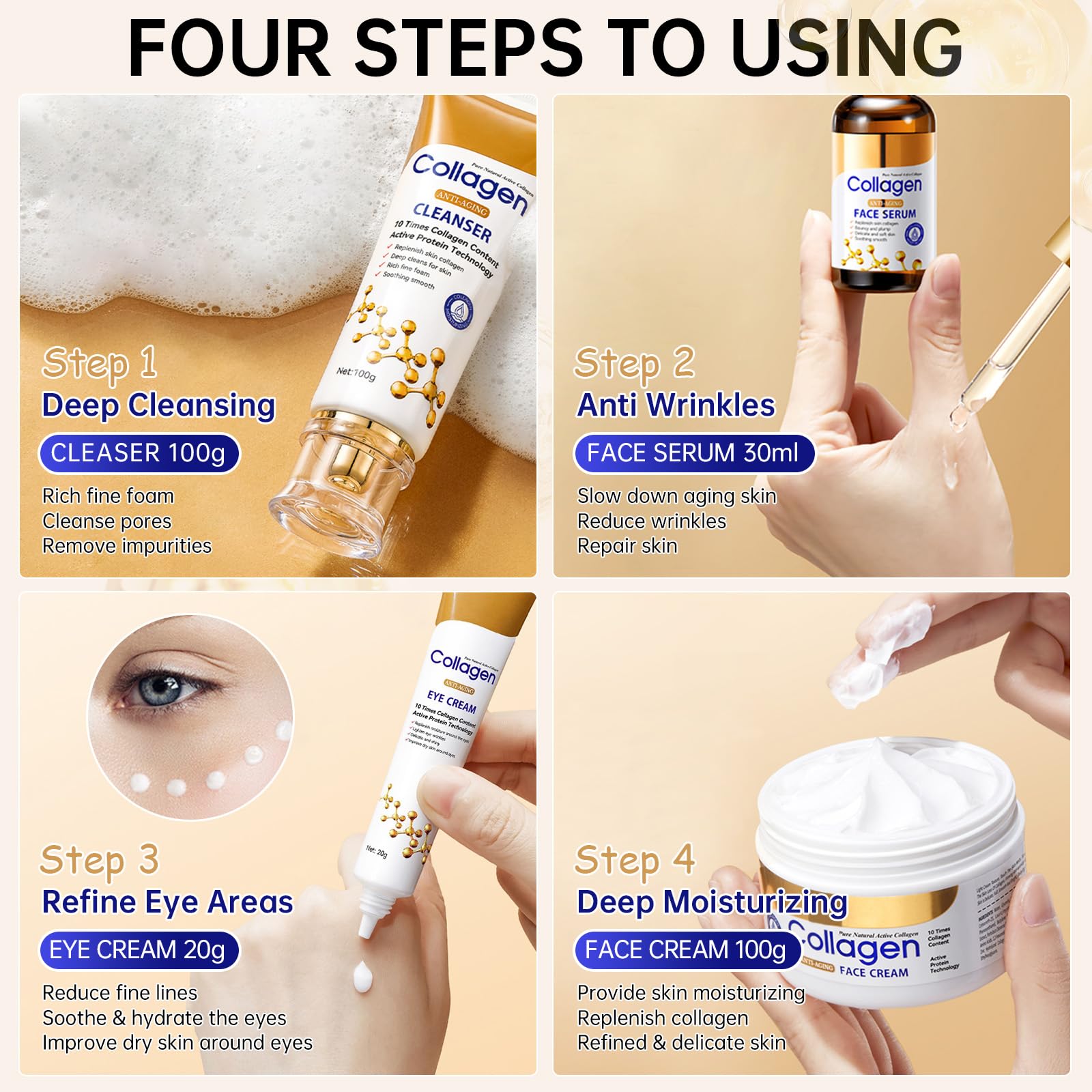 Collagen Skin Care Set, Anti Aging Skincare Set for Reduce Wrinkles, Shrink Pores, Smooth Fine Lines, Hydrating, 4 Pcs Travel Skincare Kits for Women with Cleanser, Serum, Cream, Eye Cream.