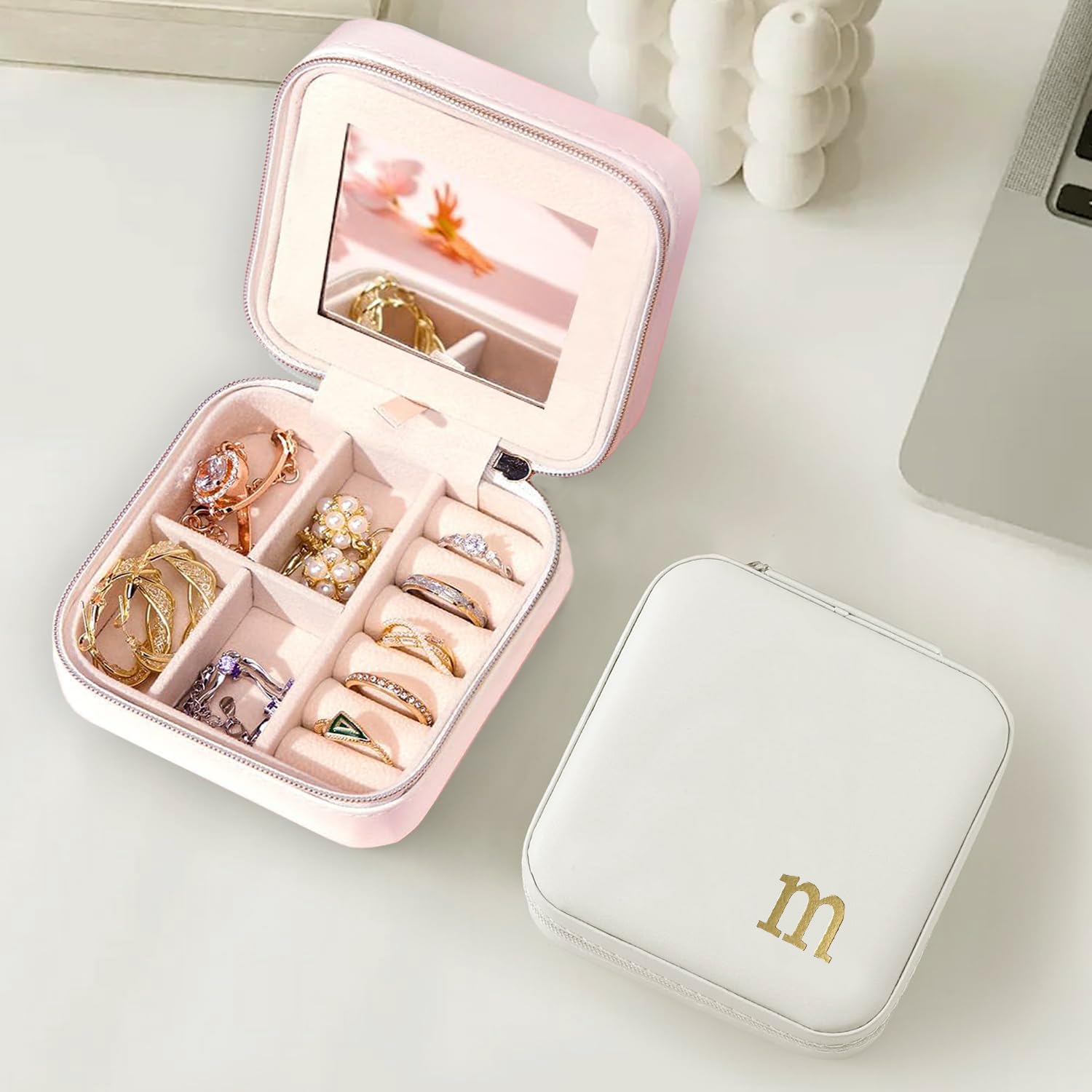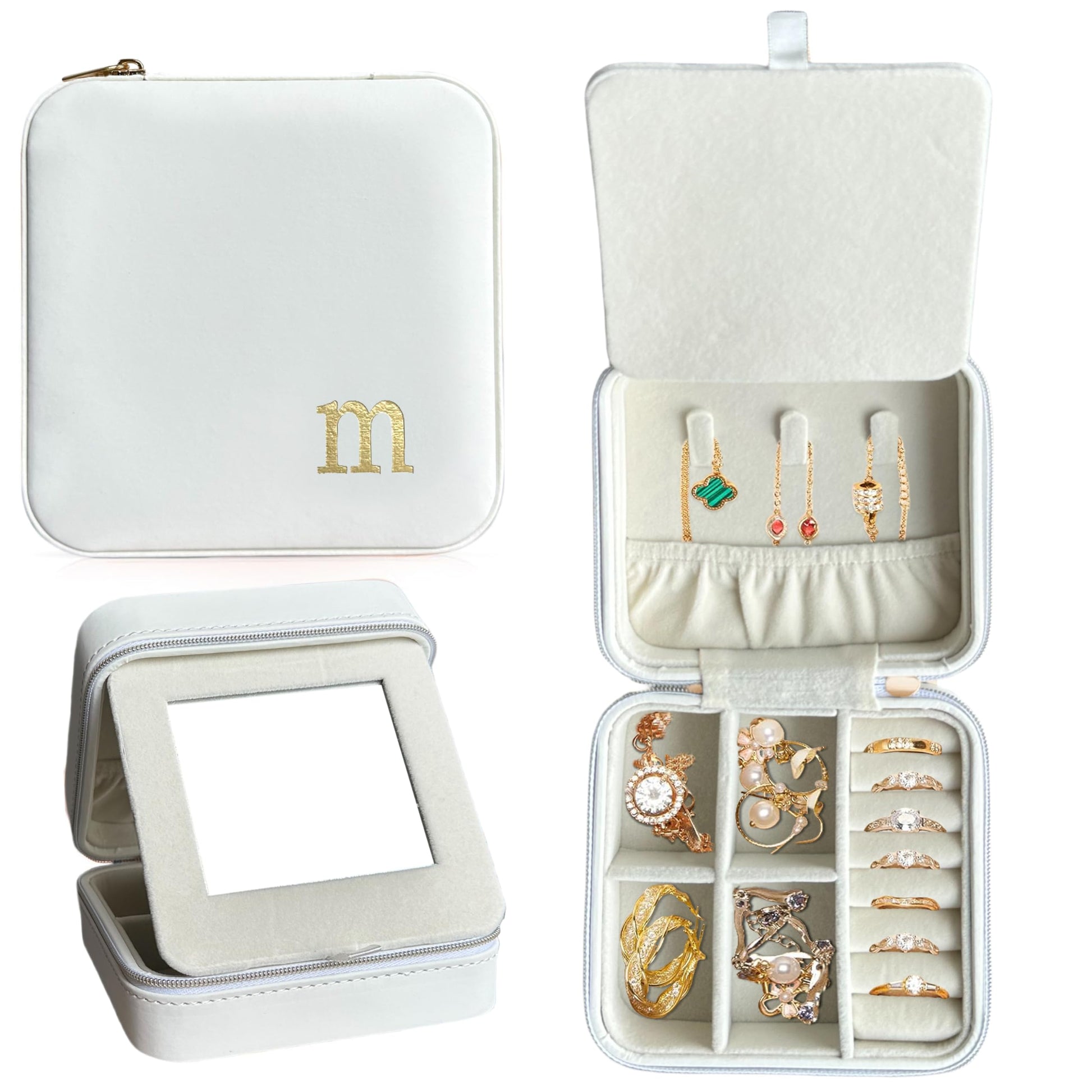 COLLECTIVE HOME - Travel Jewelry Case, Elegant Square Design with Gold Engraved Monogram, Built-in Mirror, Personalized Accessory Organizer for Rings, Necklaces, Gift for Women and Teens (m)