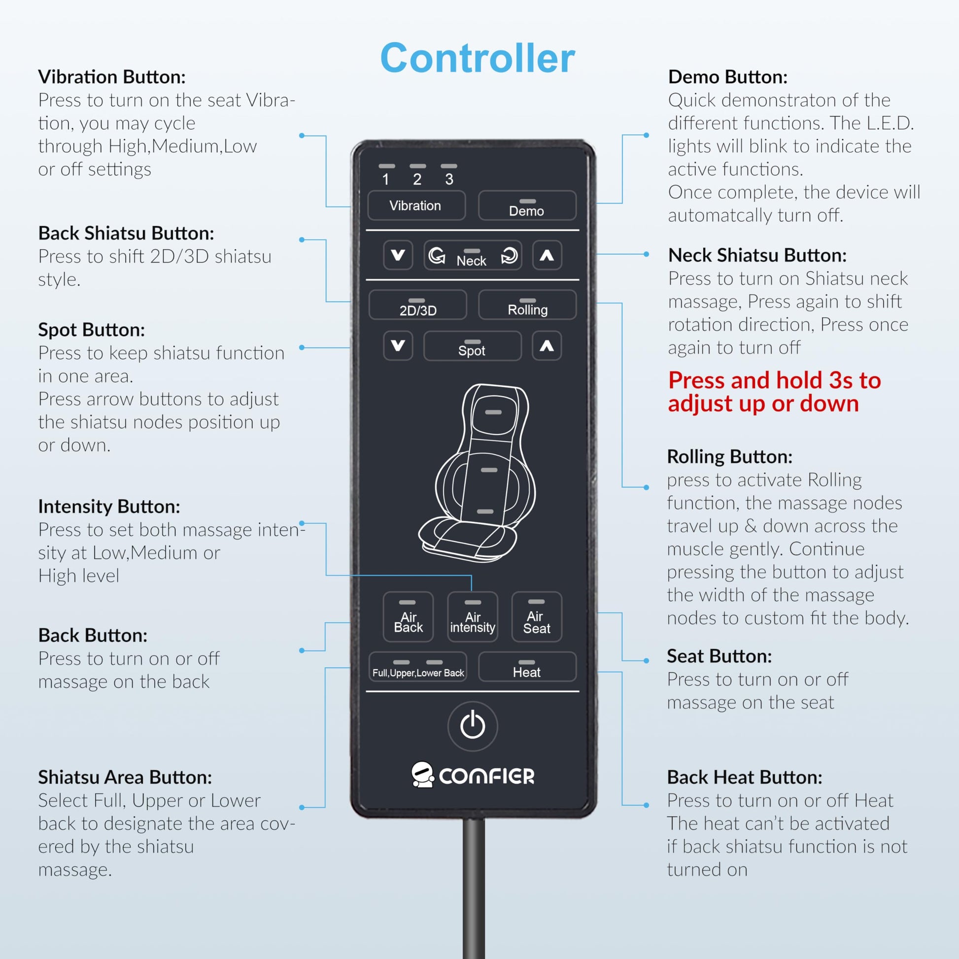 - Relax Full Body - The massage chair utilizes innovative 2D/3D Finger Pressure Shiatsu, Rolling, compression, Vibration and Heat functions to provide you an omni comfortable massage to the back like a spa massage.