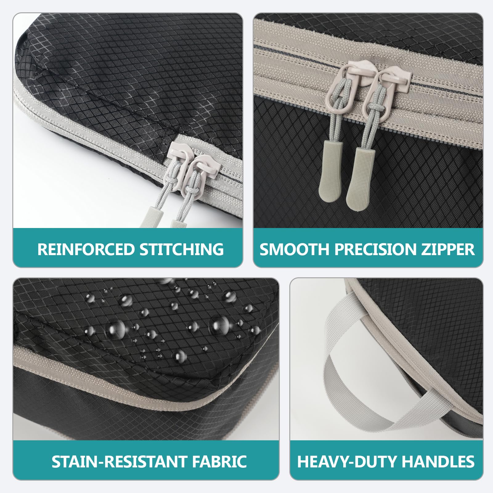 - 【Smooth Zippers & Water-Resistant Fabric】: Experience effortless gliding dual zippers and PU-coated exterior in these 4 Set Compression Packing Cubes—repelling spills and moisture to keep contents dry, making them ideal Packing Cubes for Travel to beaches or rainy destinations
