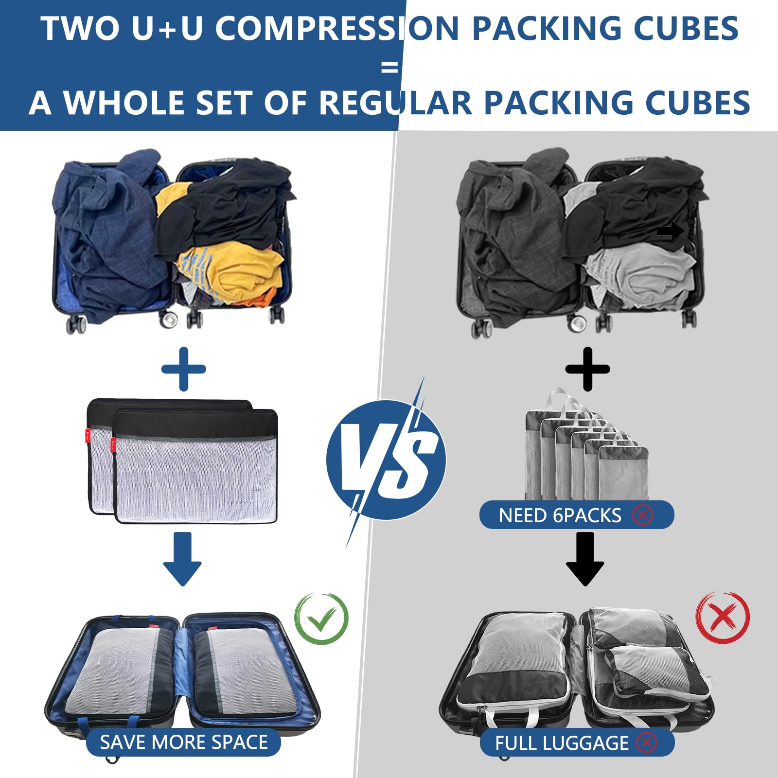 - ▶ Double Sided Compression Cubes - Expandable Carry-On Capacity: Innovative center-zipper flattens clothes to fit easily into 20-inch luggage. Tear-resistant premium fabric with reinforced stitching endures multiple uses. Avoid costly baggage fees ($50+) on budget flights—perfect alternative for smart travelers.