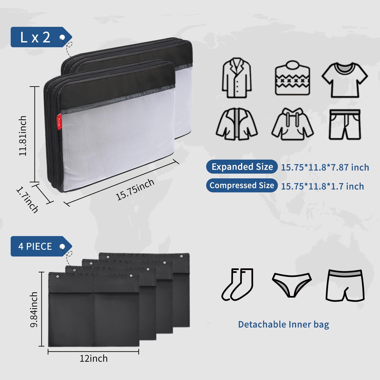 - ▶ Dual-Compartment Packing Organizers Keep Clothes Fresh: Two spacious sections separate clean clothes from dirty laundry effortlessly—ideal for sorting shirts, socks, pants, and delicate garments. Integrated mesh pockets conveniently store underwear or accessories, simplifying suitcase packing.