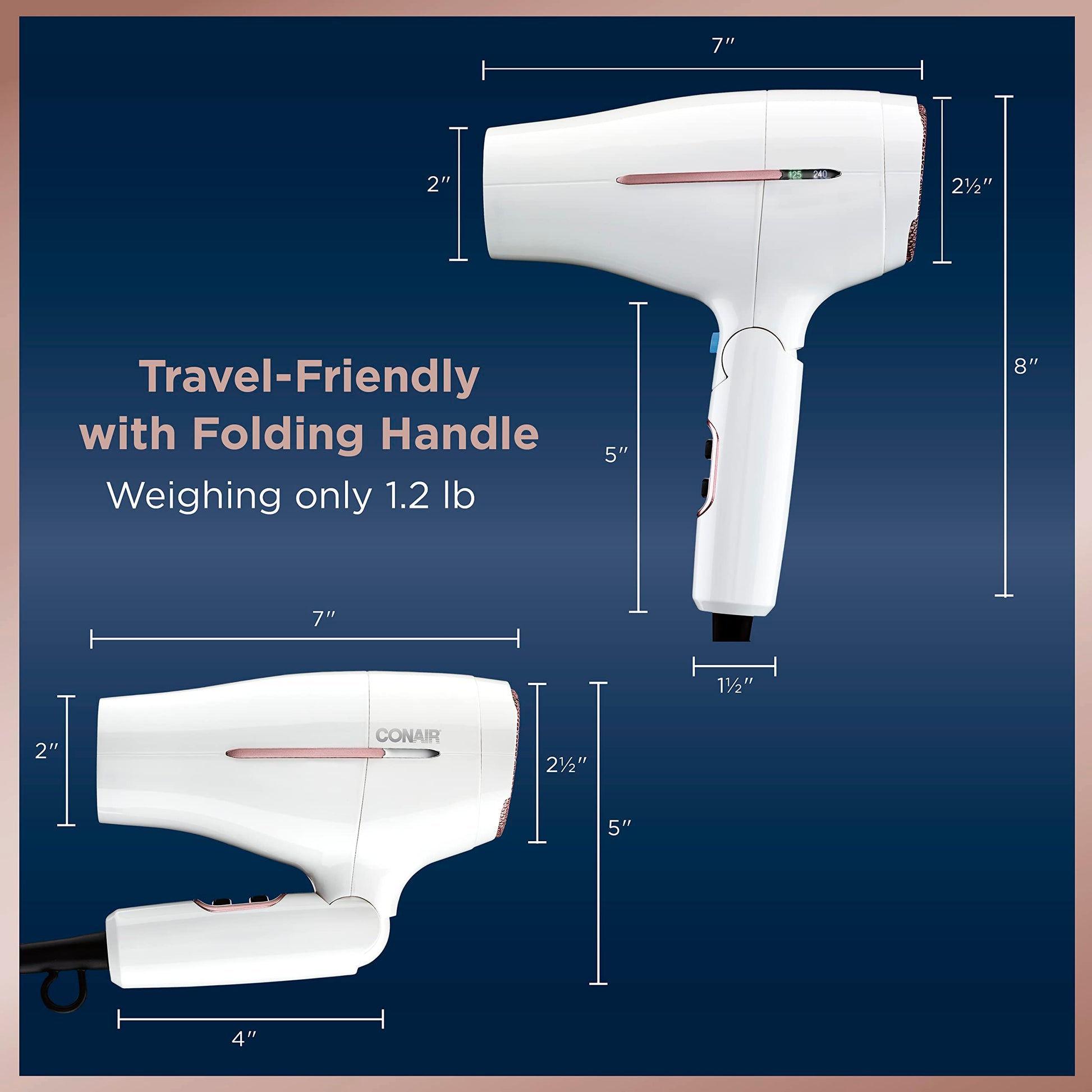 - Travel Hair Dryer: This compact travel dryer features smart voltage technology to detect foreign voltage and adjust automatically while maintaining all of your heat and speed settings, plus a folding handle for easy storage