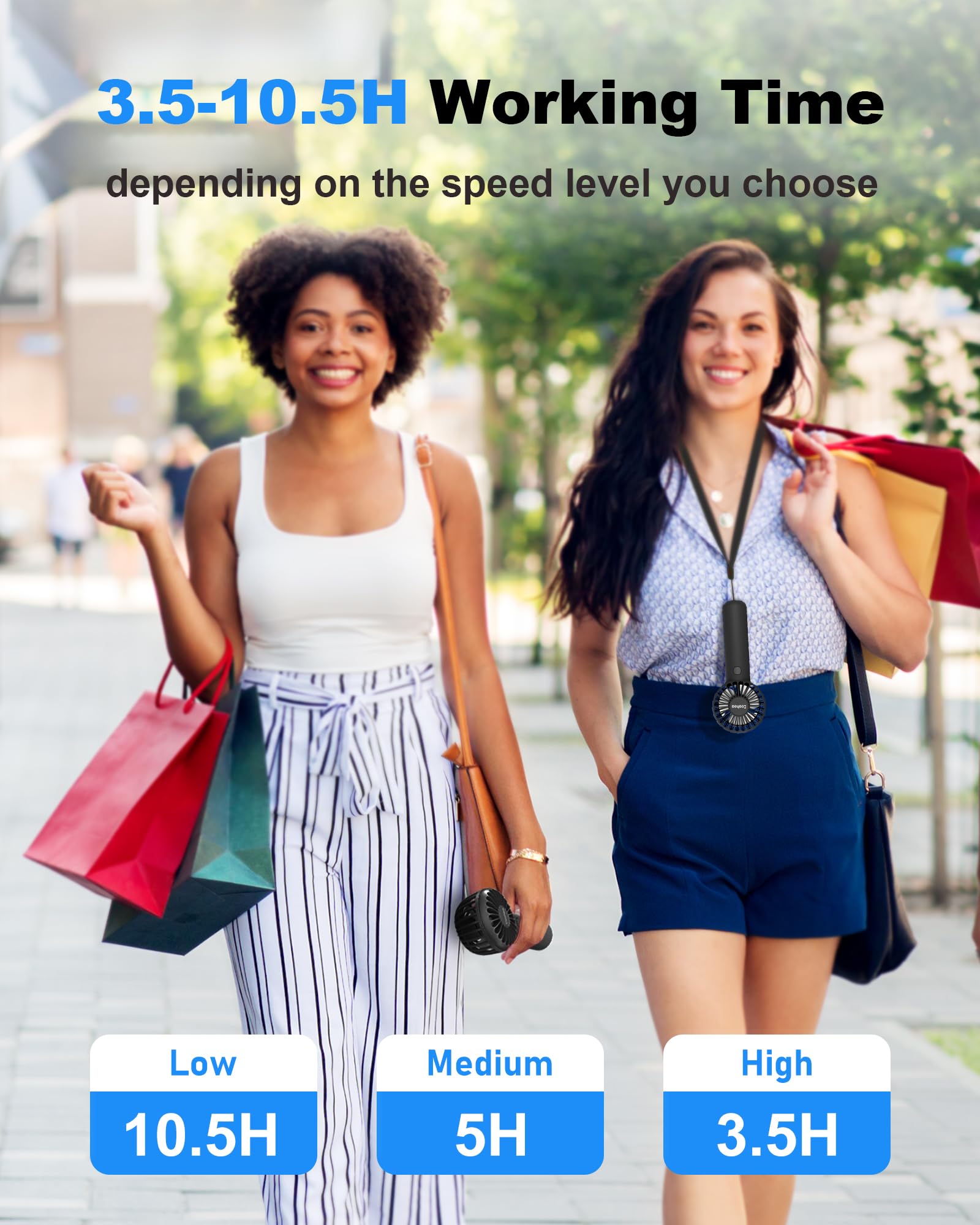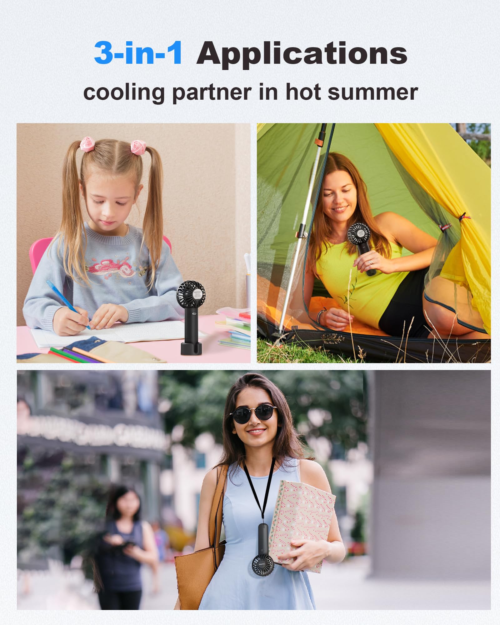 - 3 in 1 Applications: Use the Lanyard, hang the travel fan on neck when go to music concert outdoor activities without worry about forgetting. Put in the Base, the small fan becomes a desk fan when do skincare or work indoor. Portable Hand Held Fan