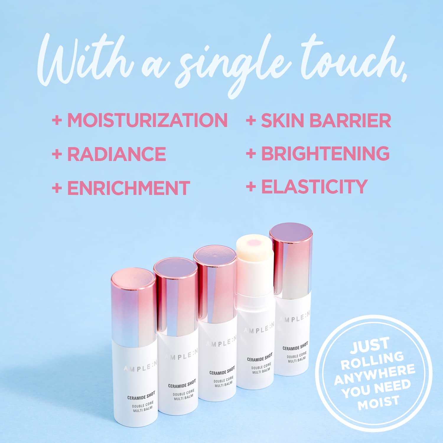 - Multi Balm Smooth Glow: With features like high moisturizing skin barrier care, elasticity focused care, and deep moisture care, the Ceramide Shot Double Core Multi-balm serves as an easy multi care that doesn’t even directly touch your skin! Enjoy a silky after-use effect with zero stickiness!