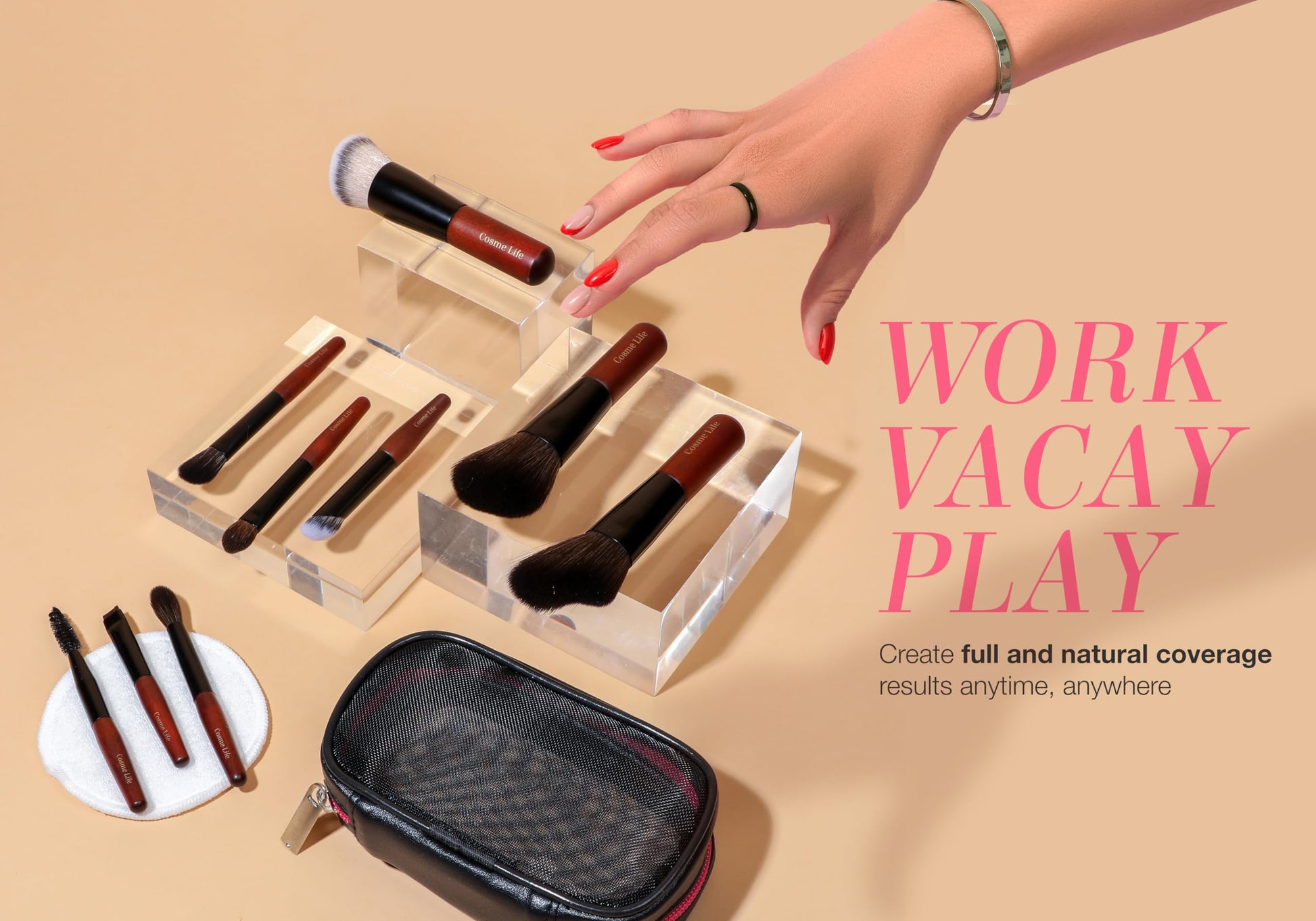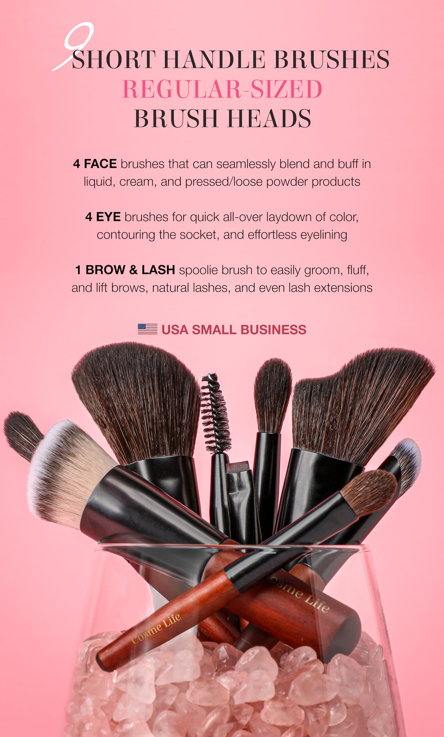 Cosme 9 FLAWLESS FACE MINI TRAVEL Makeup Brush Set: Foundation, Eyeshadow, Blush, Contour, Powder Mini Makeup Brush Set & Case. Synthetic & Natural Hair Makeup Brushes with Compact Short Handles