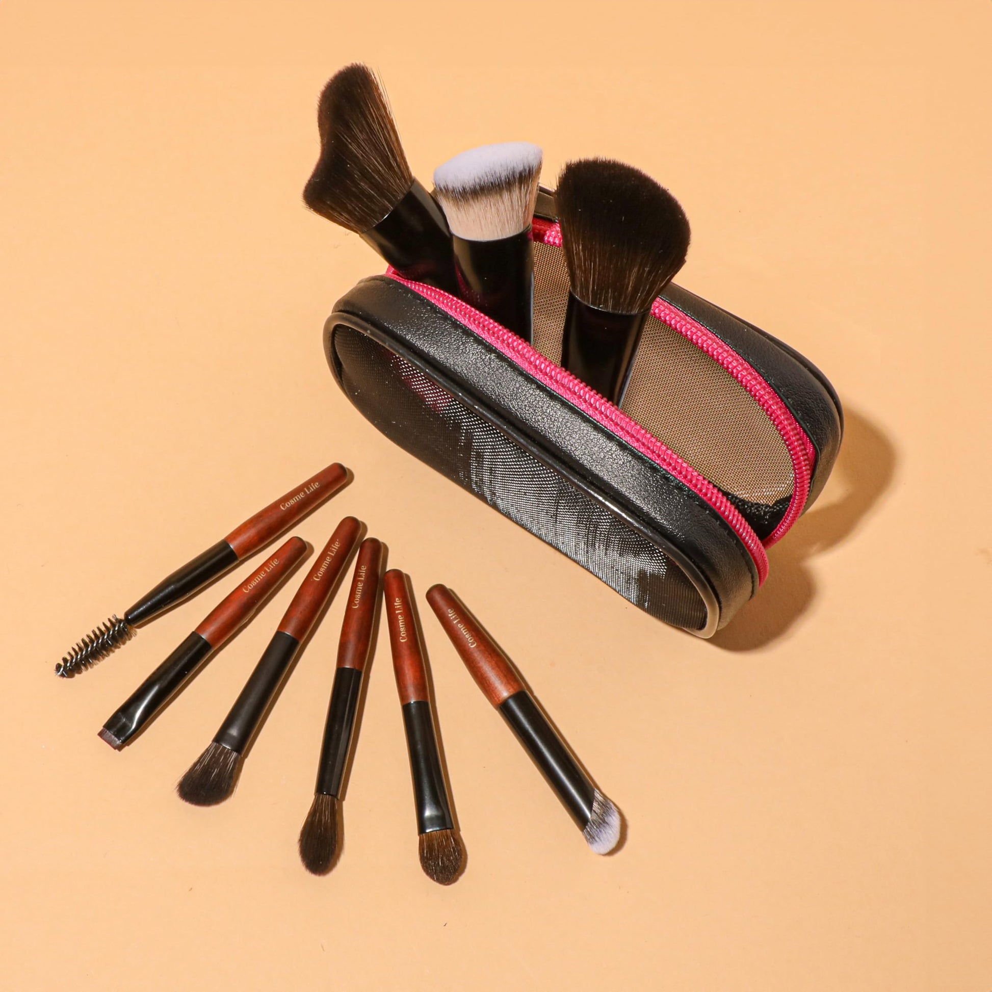 - Finally, keep it all in the compact mesh Brush Case with a eye-catching pink trim to keep it visible in your handbag, carry-on, or backpack!
