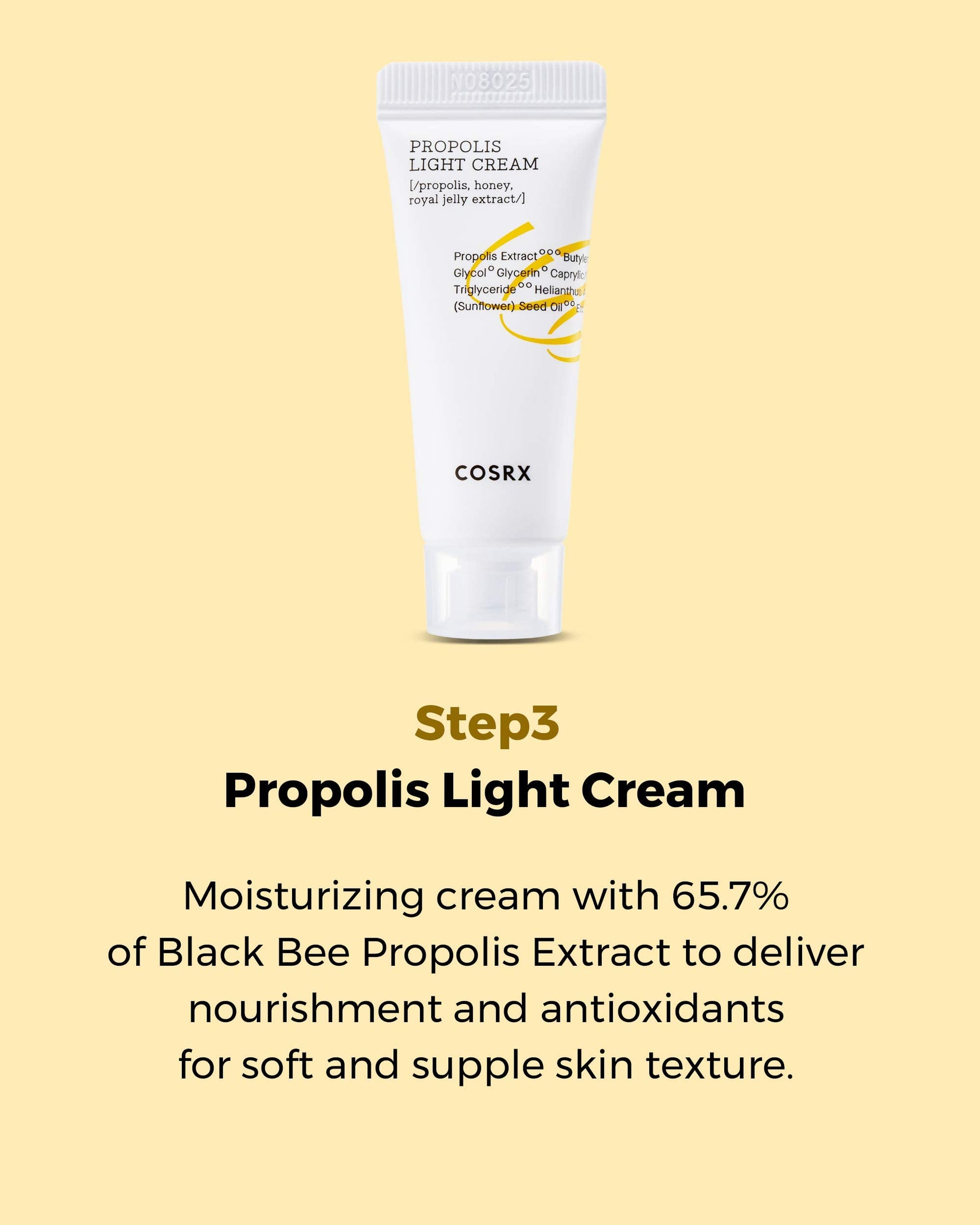 - Propolis Synergy Toner 1.01 fl. oz, Propolis Light Ampoule 0.33 fl. oz, Propolis Light Cream 0.50 oz.