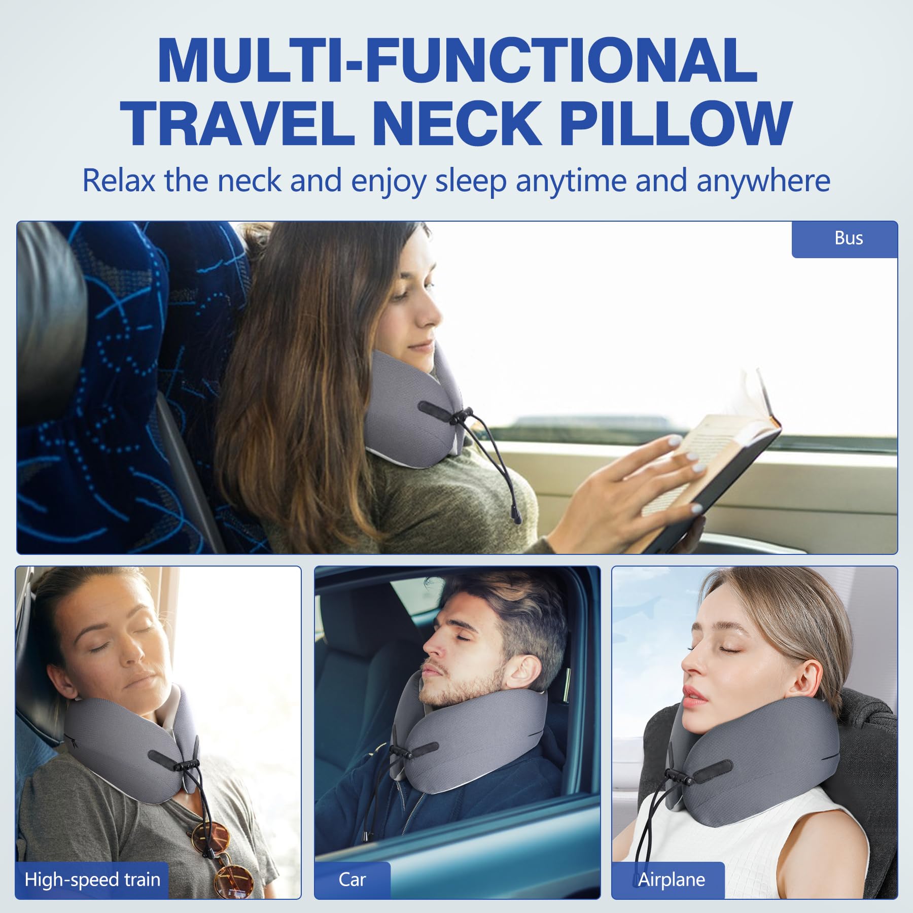 - 【 Perfect Travel Neck Airplane and Car 】 Adjustable rope design, easy to adapt to a variety of body size, easy to adjust the comfort, select for cars, bus, plane, train, recliner and home use. Provides optimal convenience while commuting, camping or any trip. The neck pillow shell is removable/washable for easy cleaning. The outer layer is made of breathable cotton fabric, which is soft and elastic, sweat-absorbing and skin-friendly.