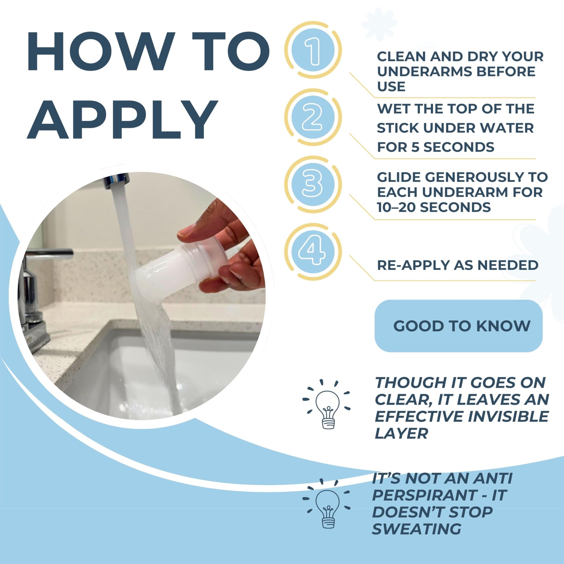 - How to Apply: Moisten the top with water and apply generously to clean, dry underarms. Glide over the skin for 20–30 seconds to ensure even coverage - though it goes on clear, it leaves an effective invisible layer.