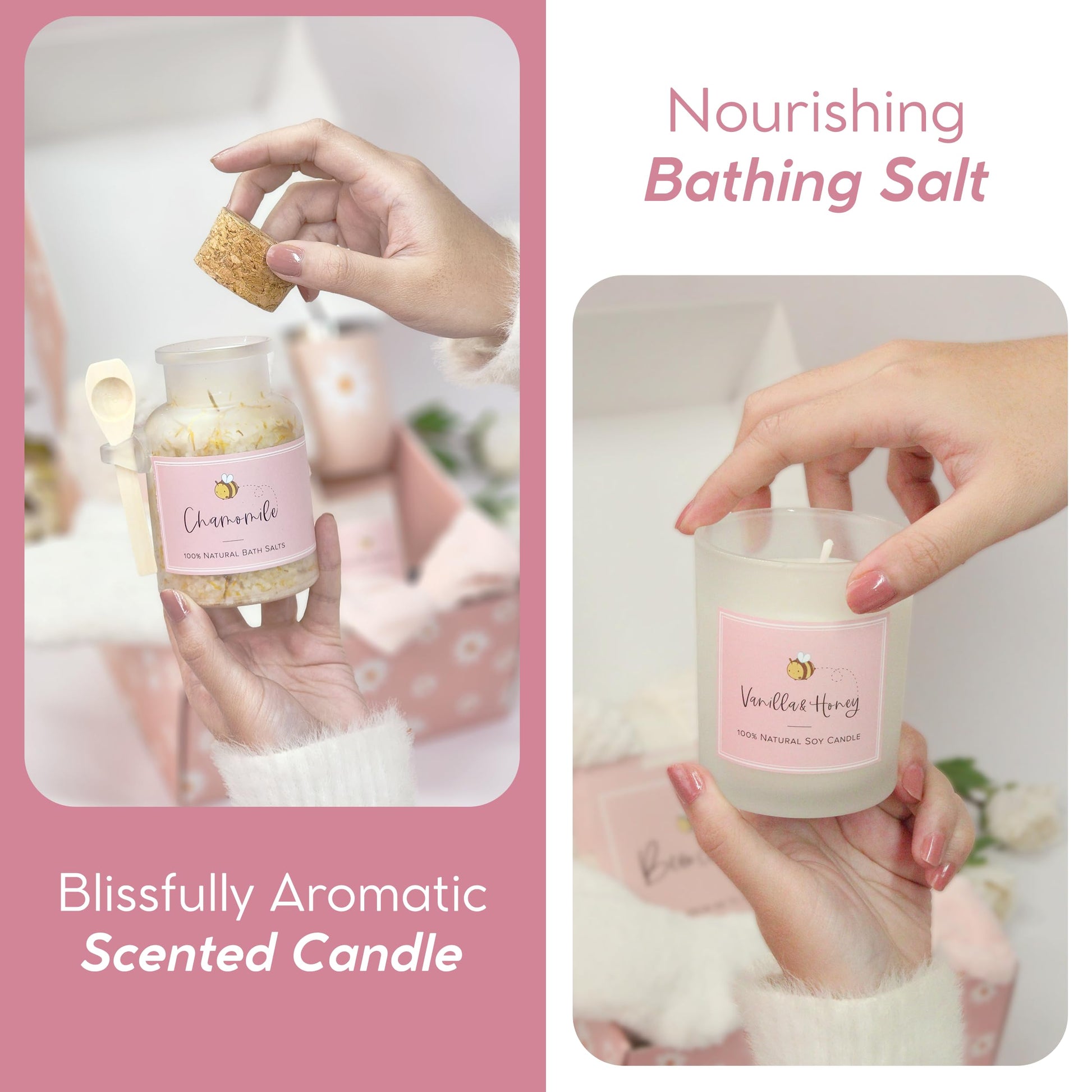 - RELAXING SCENTED PRODUCTS : Indulge in the comforting aroma of our Vanilla & Honey Fragrant Candle, made from 100% soy wax infused with natural essential oils, offering up to 30-32 hours of burn time. Dive into luxury with our Bathing Salts, a lavish blend of mineral salts and chamomile essential oil. Simply add to your bath, wait 1-2 minutes for dissolution, and enjoy blissful aromatherapy.