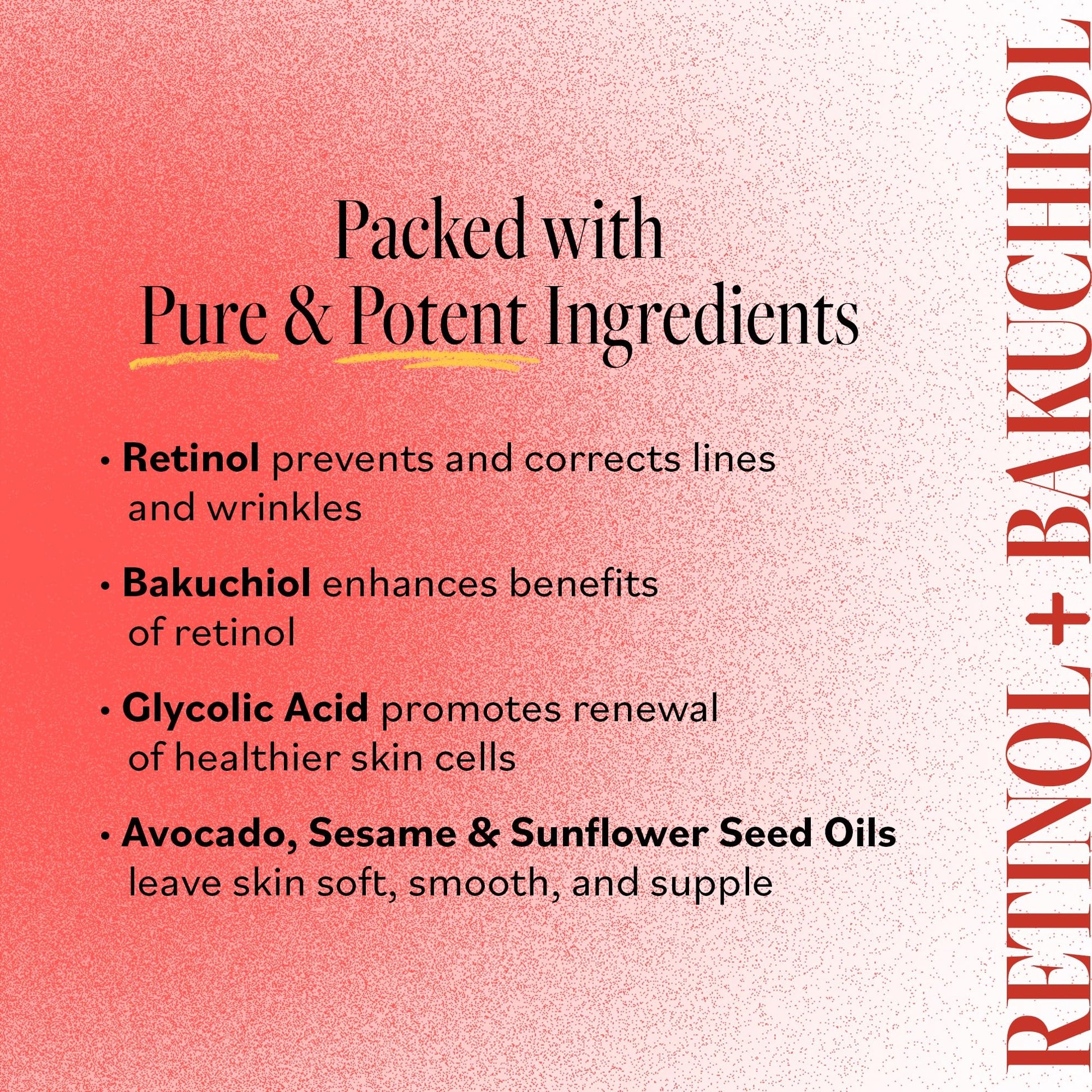 - SMOOTH, RADIANT SKIN: This anti-aging facial serum is formulated with a potent blend of Retinol + Bakuchiol to minimize the appearance of lines and wrinkles and is suitable for sensitive skin. Enriched with Vitamin E for soft, and smooth complexion