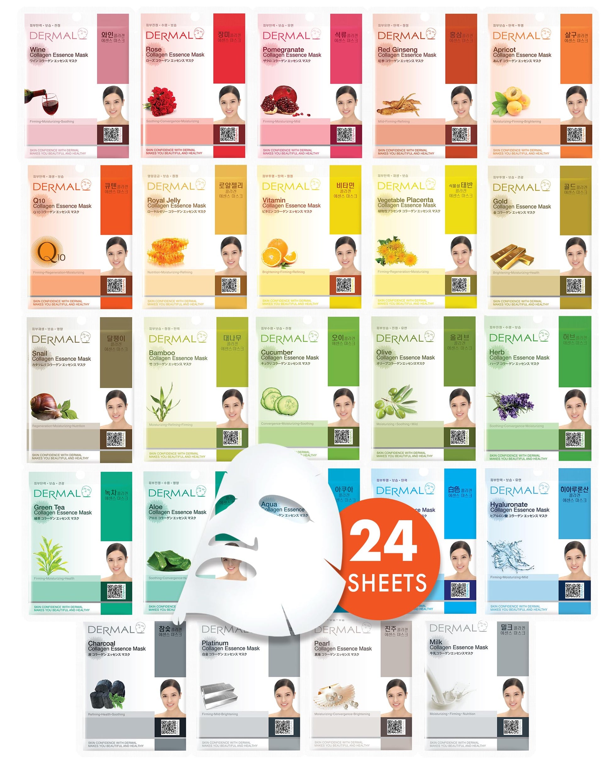DERMAL Korean Collagen Face Mask – Hydrating & Soothing Sheet Mask with Panthenol – Hypoallergenic Calming Moisture Care for All Skin Types – 24 Combo Pack