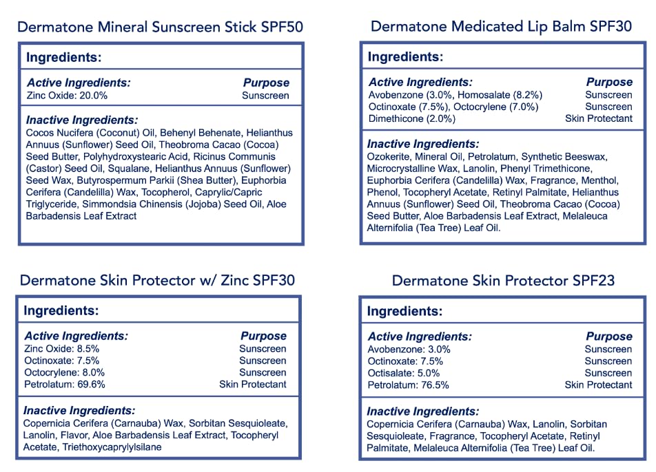 - LIP BALM WITH SPF30: Kit includes 2 Dermatone medicated lip balms offering UVA/UVB Sunscreen protection to protect & moisturize your lips. Moisturizing and healing, this might be the hardest working lip balm on the planet. Whether you’re at the beach, skiing, hiking, or shopping our lip balm spf 30 will keep you hydrated & protected!