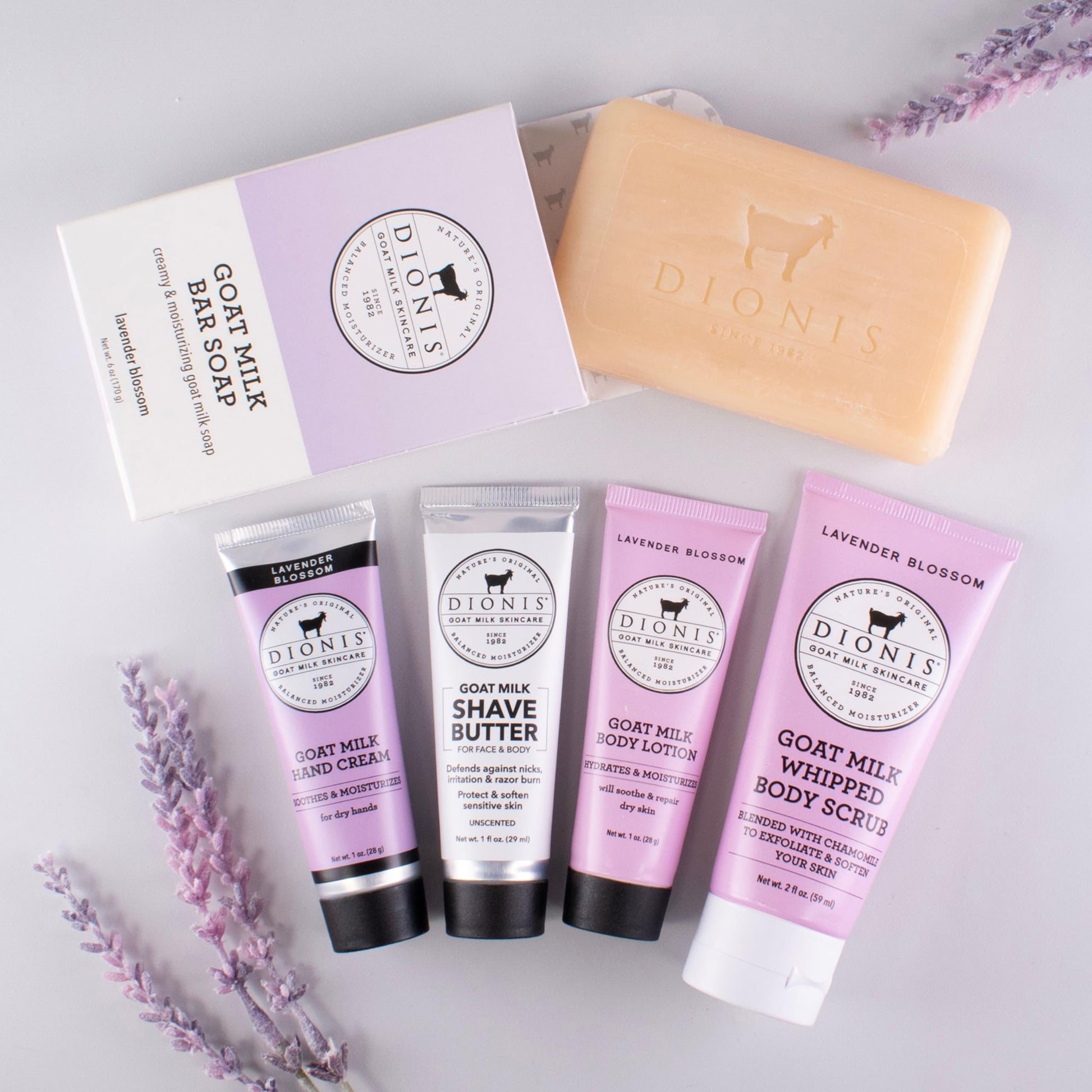 Dionis Goat Milk Skincare Lavender Blossom 6 Pc Self Care Essentials Travel Set - Bar Soap, Shave Butter, Hand Cream, Body Lotion & Whipped Sugar Body Scrub In Resealable Leak Resistant Carrying Case