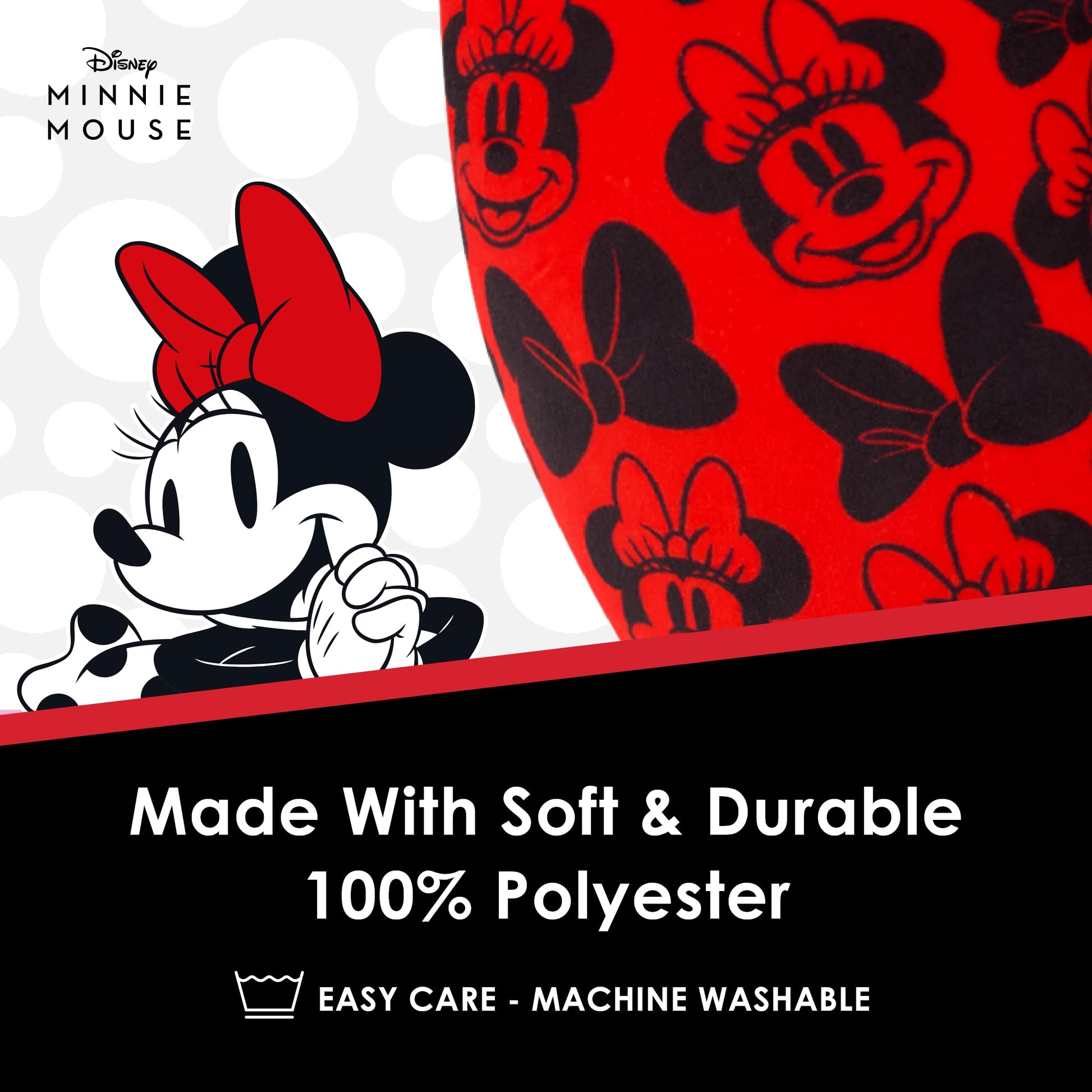 - MINNIE MOUSE NECK PILLOW: Red and black foam polyester U-shaped Minnie Mouse Disney pillow decorated with 3D Minnie Mouse ears, and also iconic Minnie Mouse faces and bows, makes for an adorable travel accessory on long car rides and flights