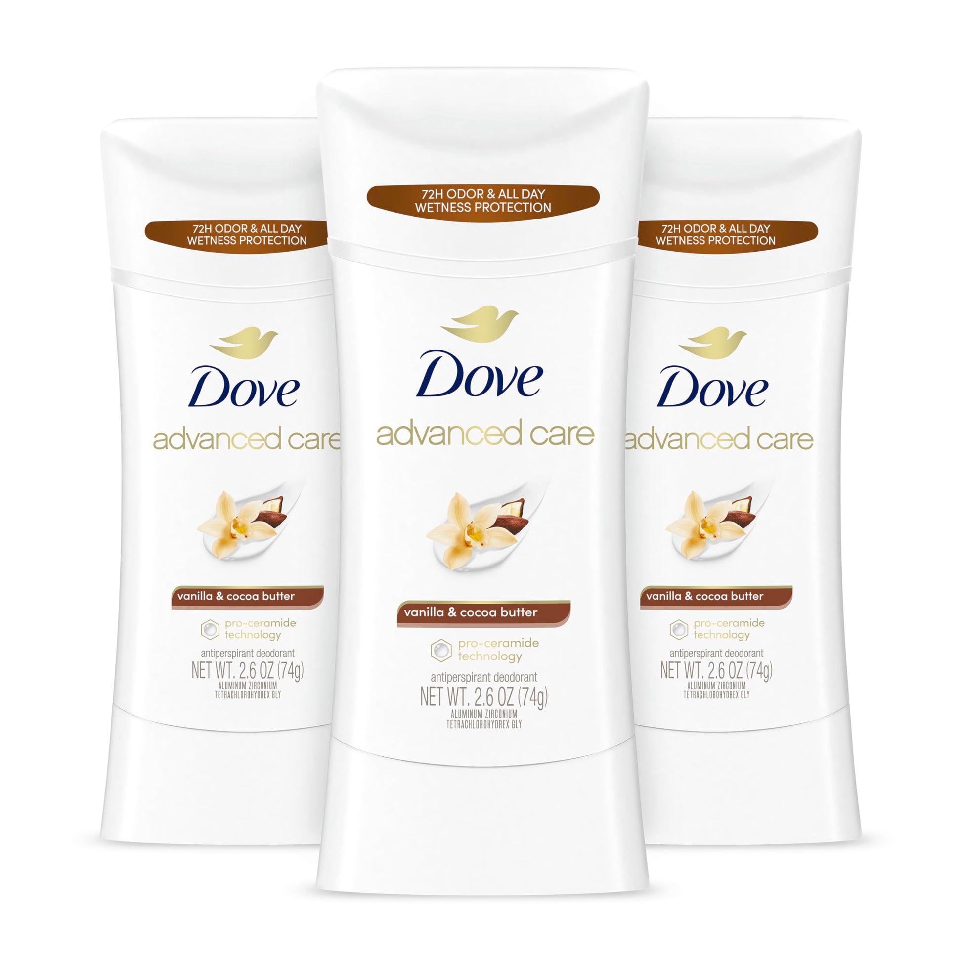 Dove Advanced Care Antiperspirant Deodorant Stick Vanilla & Cocoa Butter 3 Count Antiperspirant deodorant with Pro-Ceramide Technology 72-hour odor control and all-day sweat protection 2.6 oz