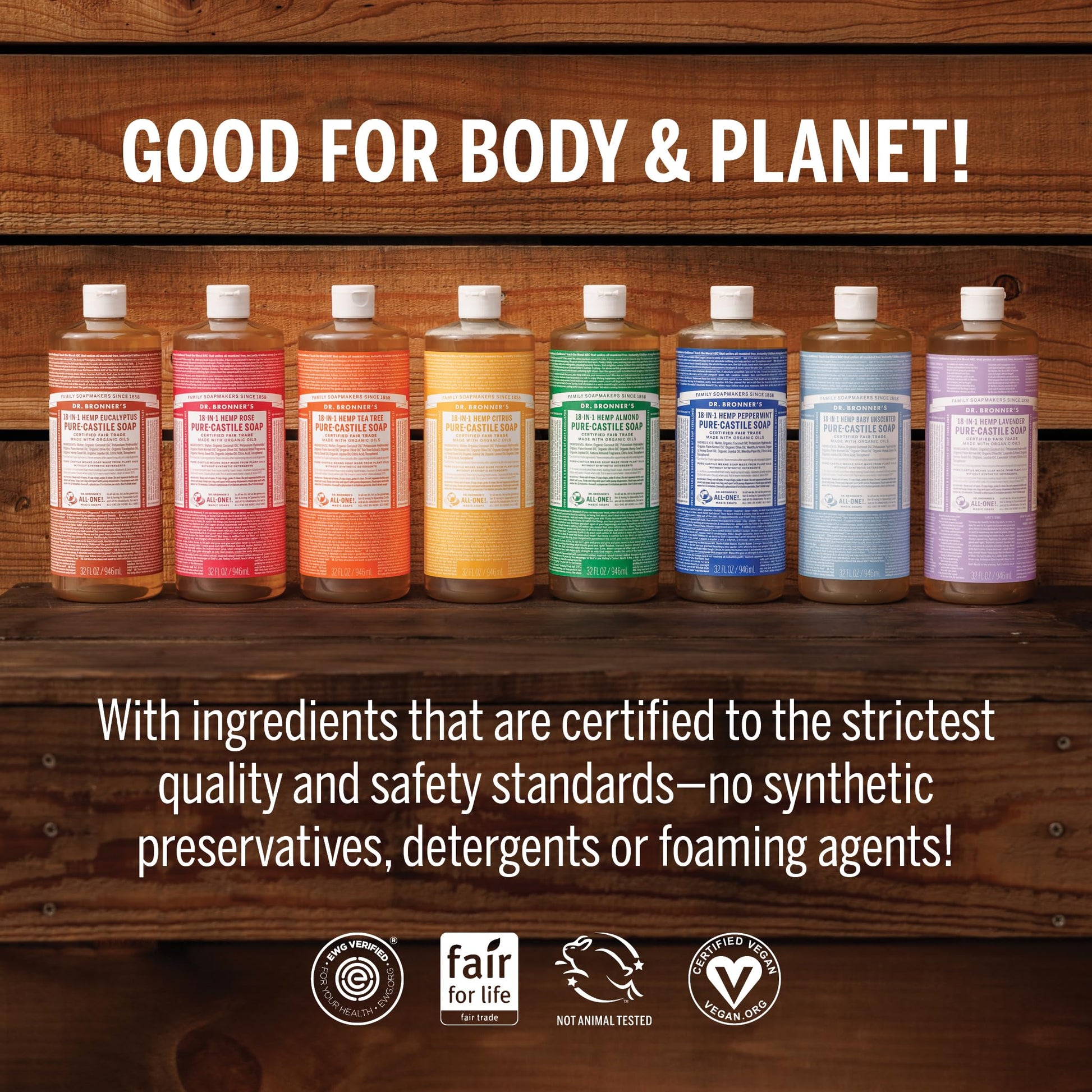 - PACKAGED IN POST-CONSUMER RECYCLED PLASTIC BOTTLES: Dr. Bronner’s bottles are made from post-consumer recycled plastic—helping divert plastic waste from landfills and reduce reliance on virgin plastic. Choosing Dr. Bronner's pure castile liquid soap supports more circular packaging solutions