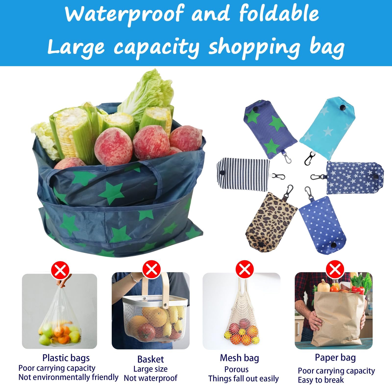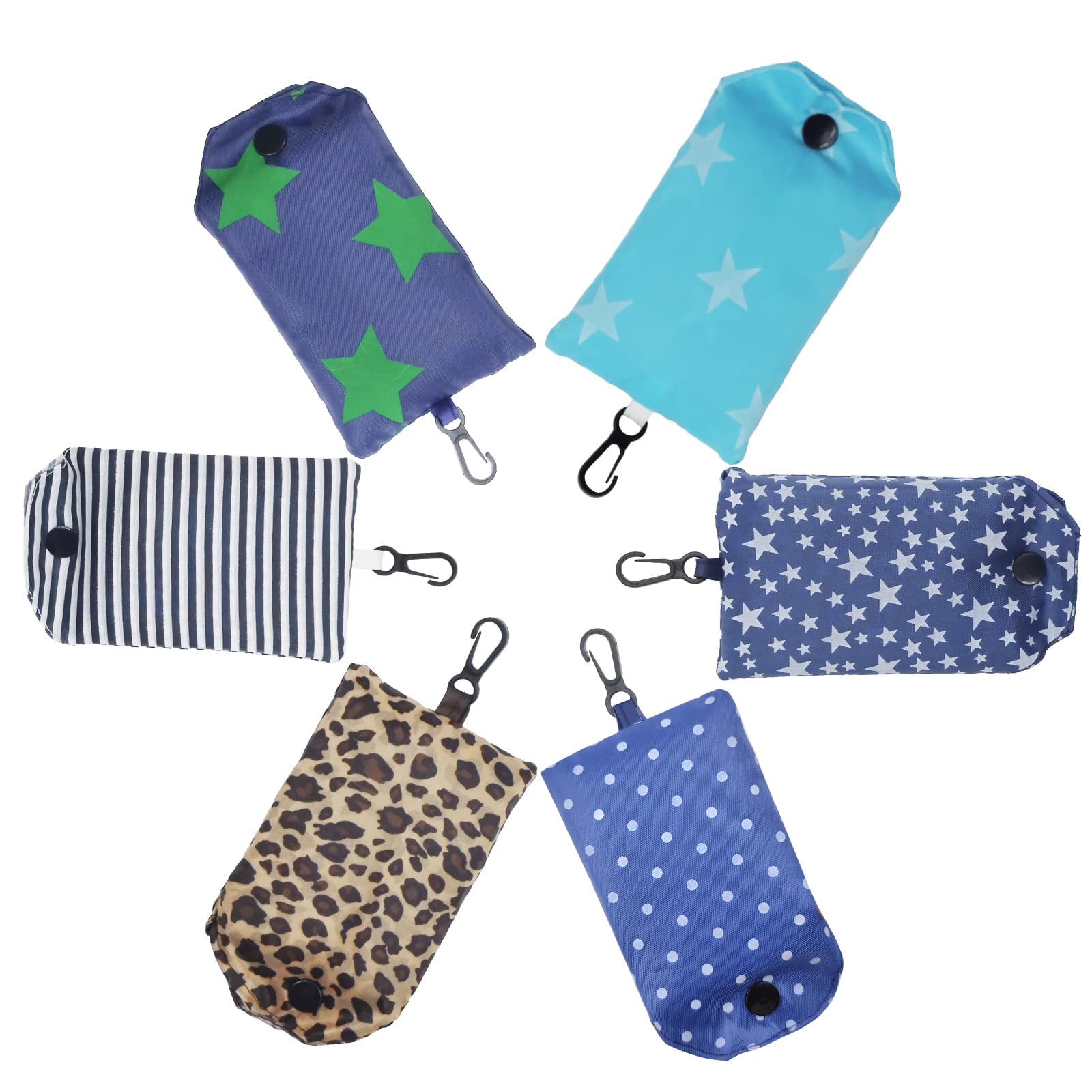 - 【Rich Quantities】6 pcs shopping bags with 6 different special patterns, presenting a stylish and generous aesthetic, The Multifunctional shopping bag is perfect for grocery shopping, travel, home oragnizing, outdoor camping, etc,folds into a small bag when not in use, has a hook and can be stored in a handbag, bag or car without taking up much space.