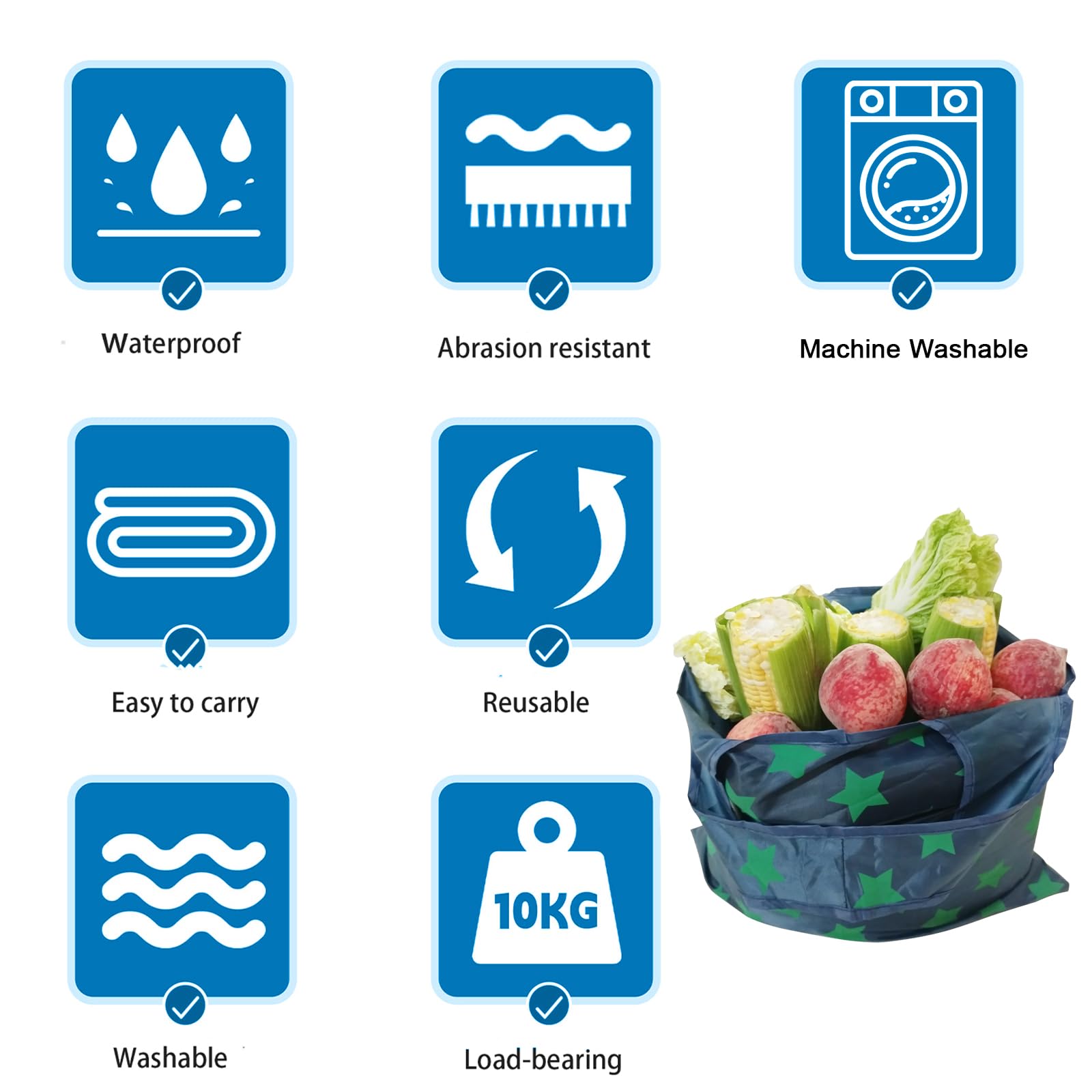 - 【Quality Material】Eco-friendly shopping bag made from T190 polyester fabric , waterproof,machine washable, durable, reusable, won't break easily,Recommended weight capacity is 8kg, suitable for most household shopping and travel scenarios. Laboratory testing confirms a maximum safe weight capacity of 10kg. To prevent excessive stretching or damage to the bag, do not exceed this limit and exercise caution when loading items with sharp edges or corners