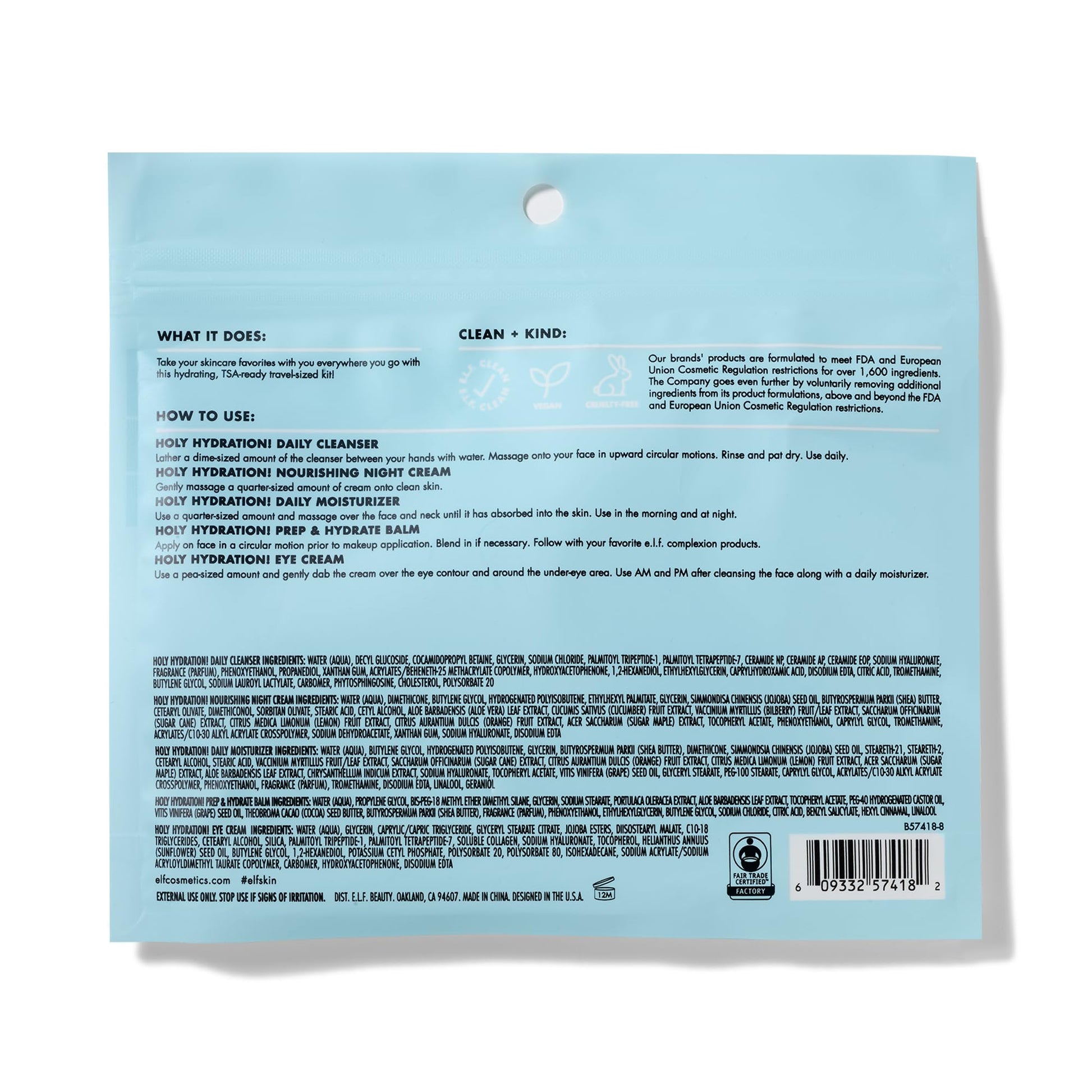 Details: What it is: Five hydrating skincare favorites packed in one travel-sized kit. Why we love: A complete skincare routine in one kit TSA-friendly sizes Moisturizing, vitamin-infused formulas Key Ingredients: Citric Acid - Gently exfoliates and evens skin tone Cucumber Extract - Calms skin and reduces puffiness Shea Butter - Nourishes and softens skin Aloe Vera - Soothes and provides anti-inflammatory benefits Jojoba Oil - Locks in moisture Vitamin E - Brings a refreshing moisture boost A skincare routine that’s ready to go where you are! This convenient travel-sized kit includes five moisturizing skincare faves that will deeply nourish, brighten, and soothe all skin types. Each product packs a punch and is infused with skin-quenching ingredients that will hydrate your skin from the inside out. Kit includes: Daily Face Cleanser (30ml) - A gentle daily cleanser infused with Citric Acid that removes dirt, impurities, and makeup while brightening skin. Prep and Hydrate Balm (6g) - A water-based balm stick that instantly hydrates, improves skin texture, and preps skin for makeup application. Daily Hydration Moisturizer (25 ml) - A lightweight cream moisturizer infused with essential nutrients to deeply nourish the skin. Nourishing Night Cream (15g) - A soothing and calming cream that revitalizes the skin overnight. Illuminating Eye Cream (7g) - A rich and nourishing eye cream that reawakens your delicate eye area. All e.l.f. products are made from skin-loving ingredients you want, minus the toxins you don’t—all at good-for-you prices. All e.l.f. products are 100% vegan, cruelty-free, and leaping bunny certified. Because kindness is chic. "