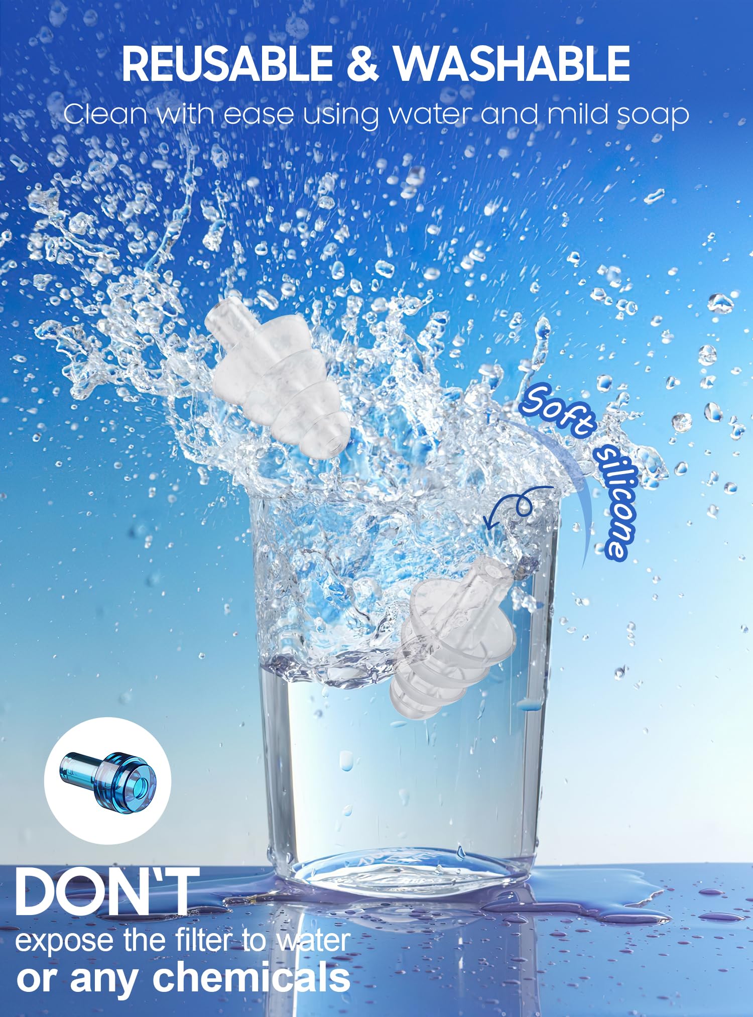 - WASHABLE AND REUSABLE: The earplugs are reusable, so they'll save you money and reduce waste. They’re also washable and hypoallergenic. Clean them regularly with warm soapy water and you’ll be able to use them for a long time