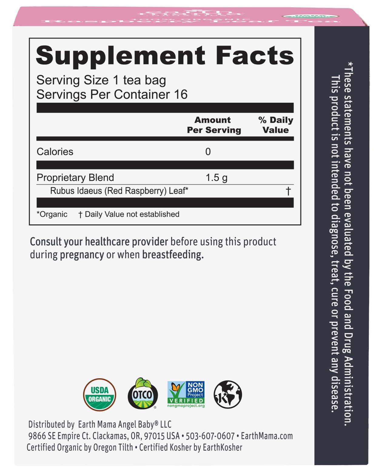 - USDA Certified Organic: Formulated by a nurse and herbalist, Earth Mama’s Organic Raspberry Leaf Tea is Non-GMO Project Verified and Certified Kosher, so it’s safe for the whole family.