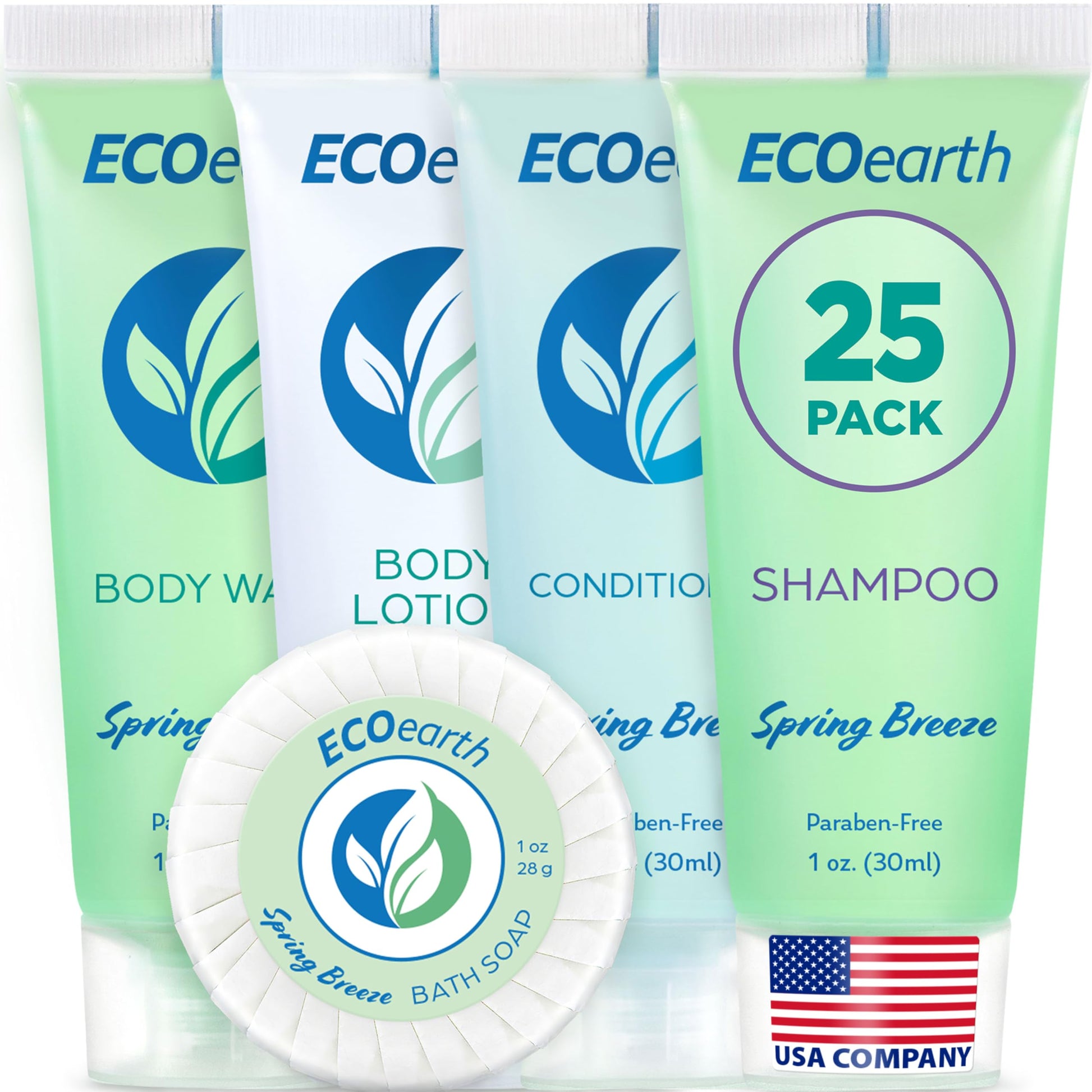 EcoEarth Hotel Toiletries Bundle (Spring Breeze, 1 oz Each, 125 Pieces) 5-Piece Set: 25 Each Round Bar Soap, Shampoo, Conditioner, Body Lotion & Body Wash - Bulk Mini Guest Amenities