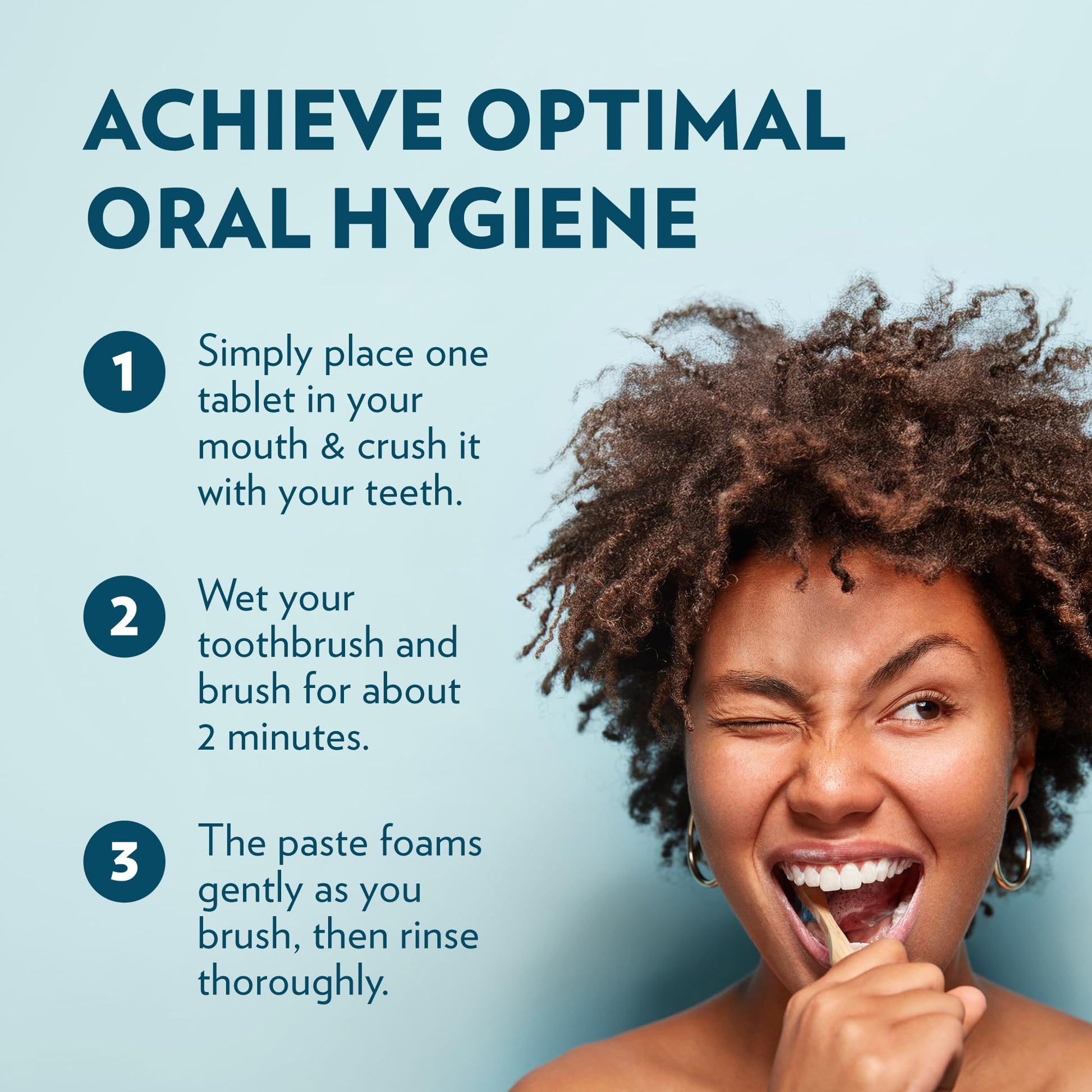 - DIRECTIONS FOR USE - Simply place one tablet in your mouth, crush it with your teeth, and wet your toothbrush. Brush for about 2 minutes as the paste foams gently, then rinse thoroughly. Achieving optimal oral hygiene has never been easier!