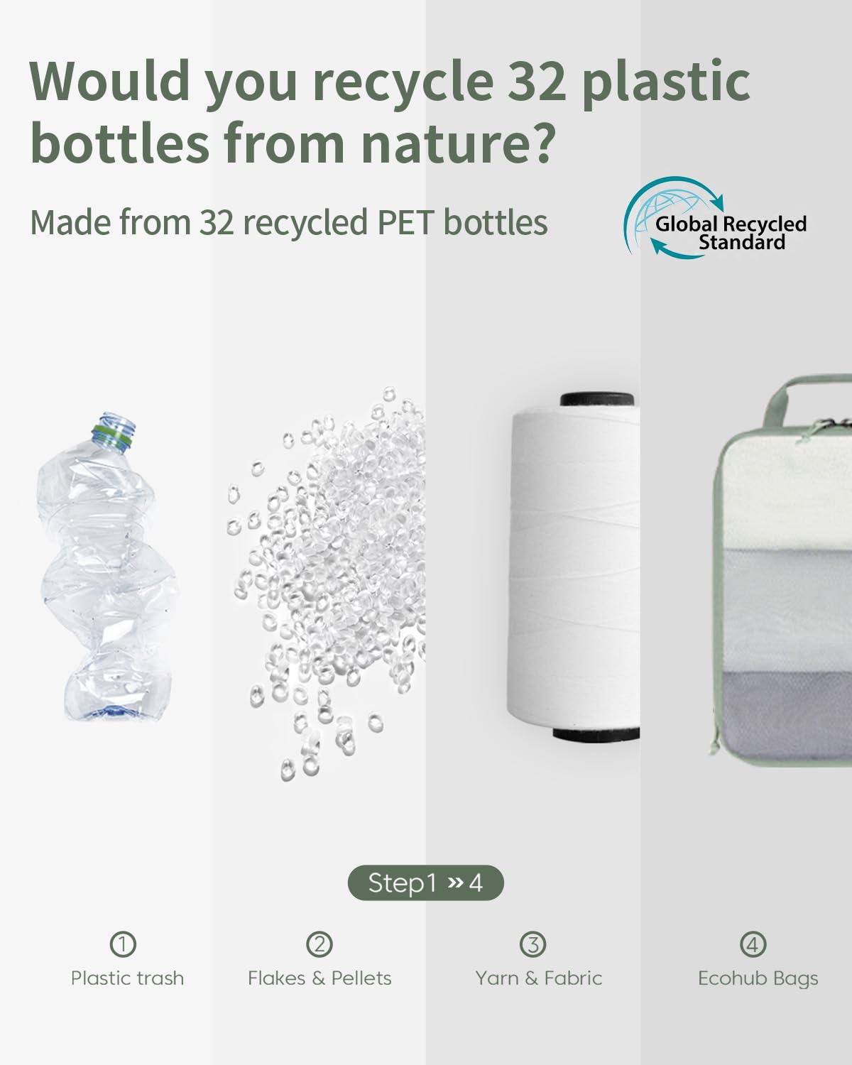 - 【SUSTAINABLE AND GUARANTEE】: ECOHUB compression packing cubes are made from at least 50% recycled materials, with fabric and lining crafted from 32 recycled PET plastic bottles. The lightweight fabric combined with YKK zippers and reinforced ripstop stitching, good gifts for women men mom, ensure durability for travel, road trip, beach vacation, cruise ship. If you have any concerns, reach out through your order (Patent Pending)