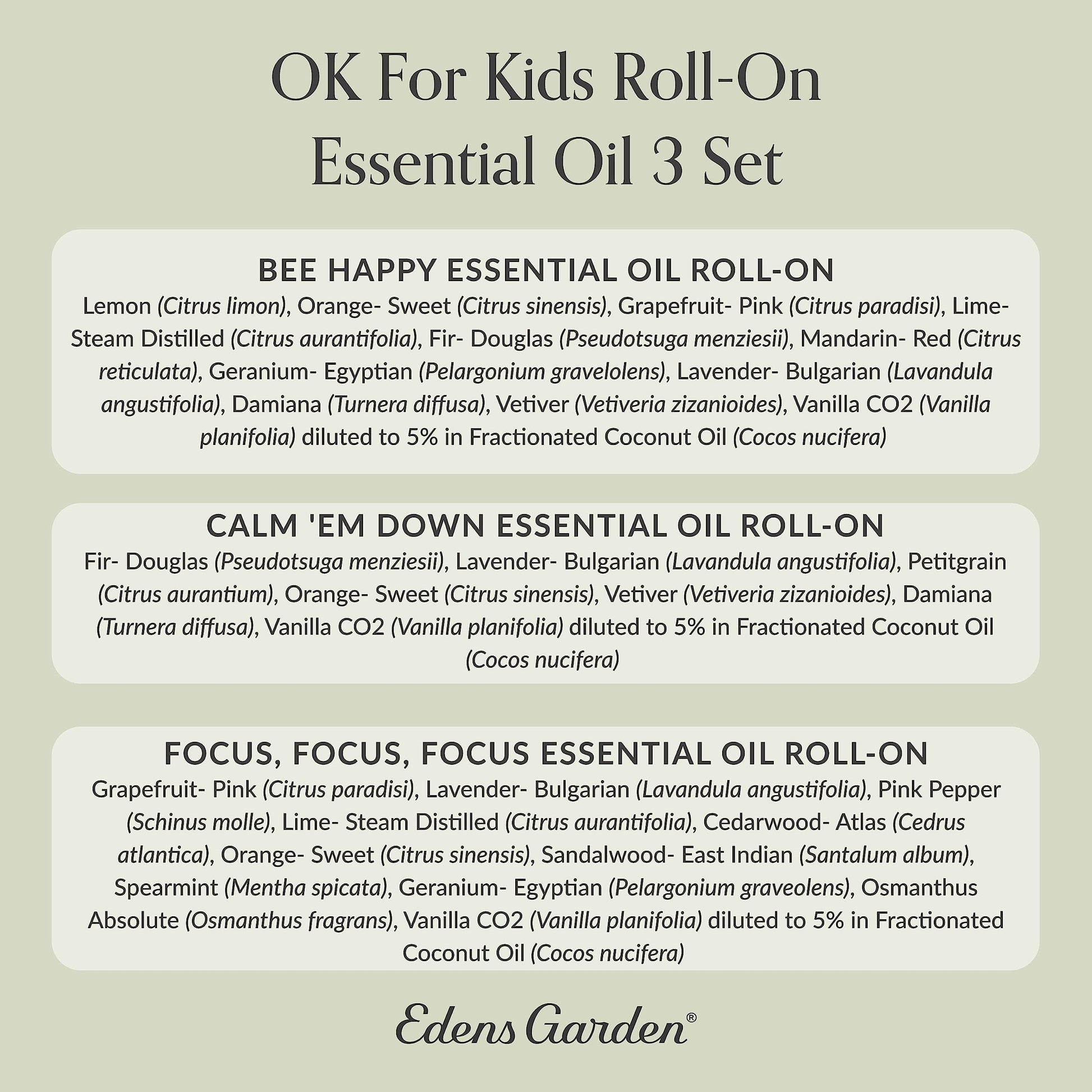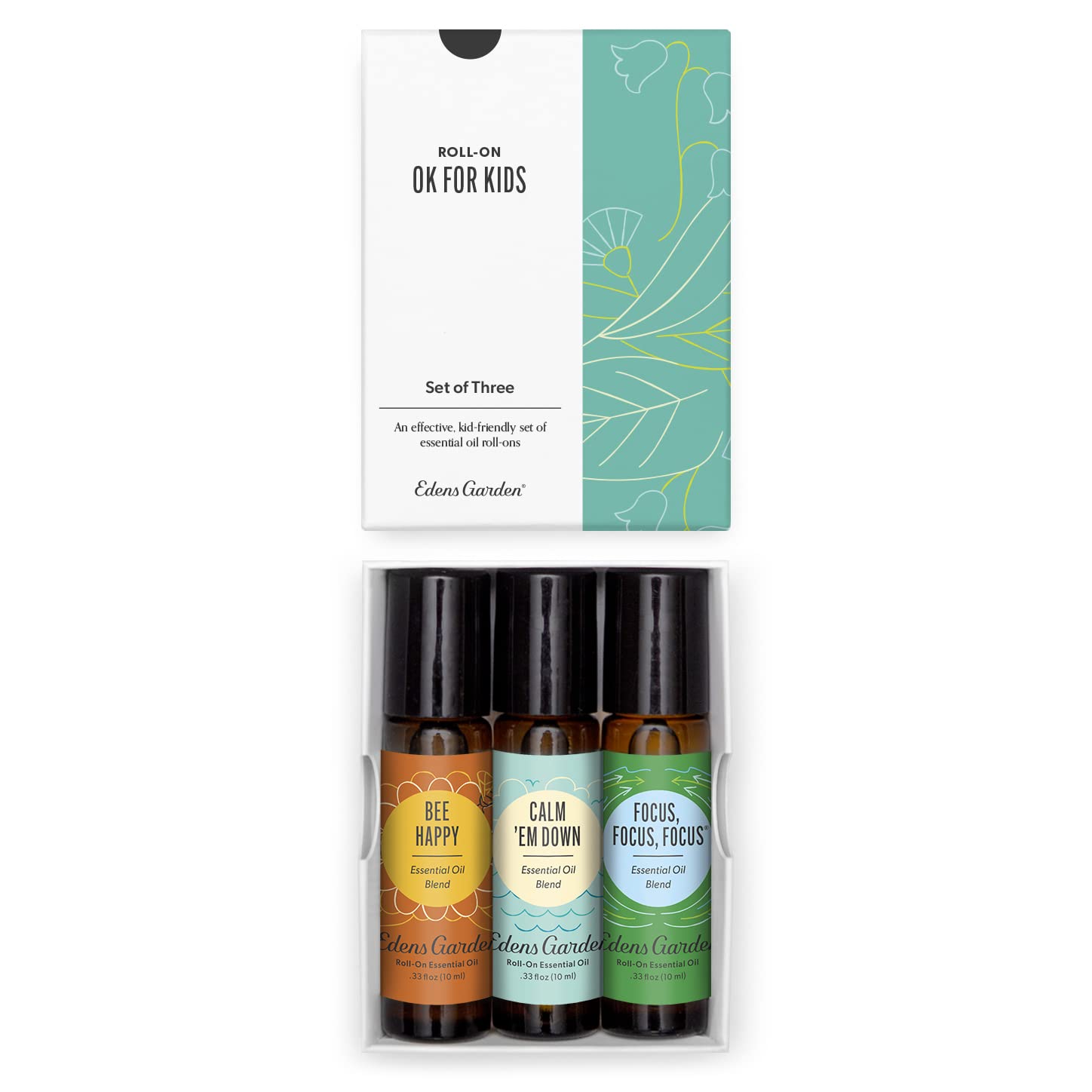 Edens Garden OK For Kids Essential Oil Roll-On 3 Set – 100% Pure Therapeutic Grade, Natural Aromatherapy Blends – Gentle & Pre-Diluted, Includes Bee Happy, Calm 'Em Down & Focus, 10 ml Roll-On/ 3 Pack