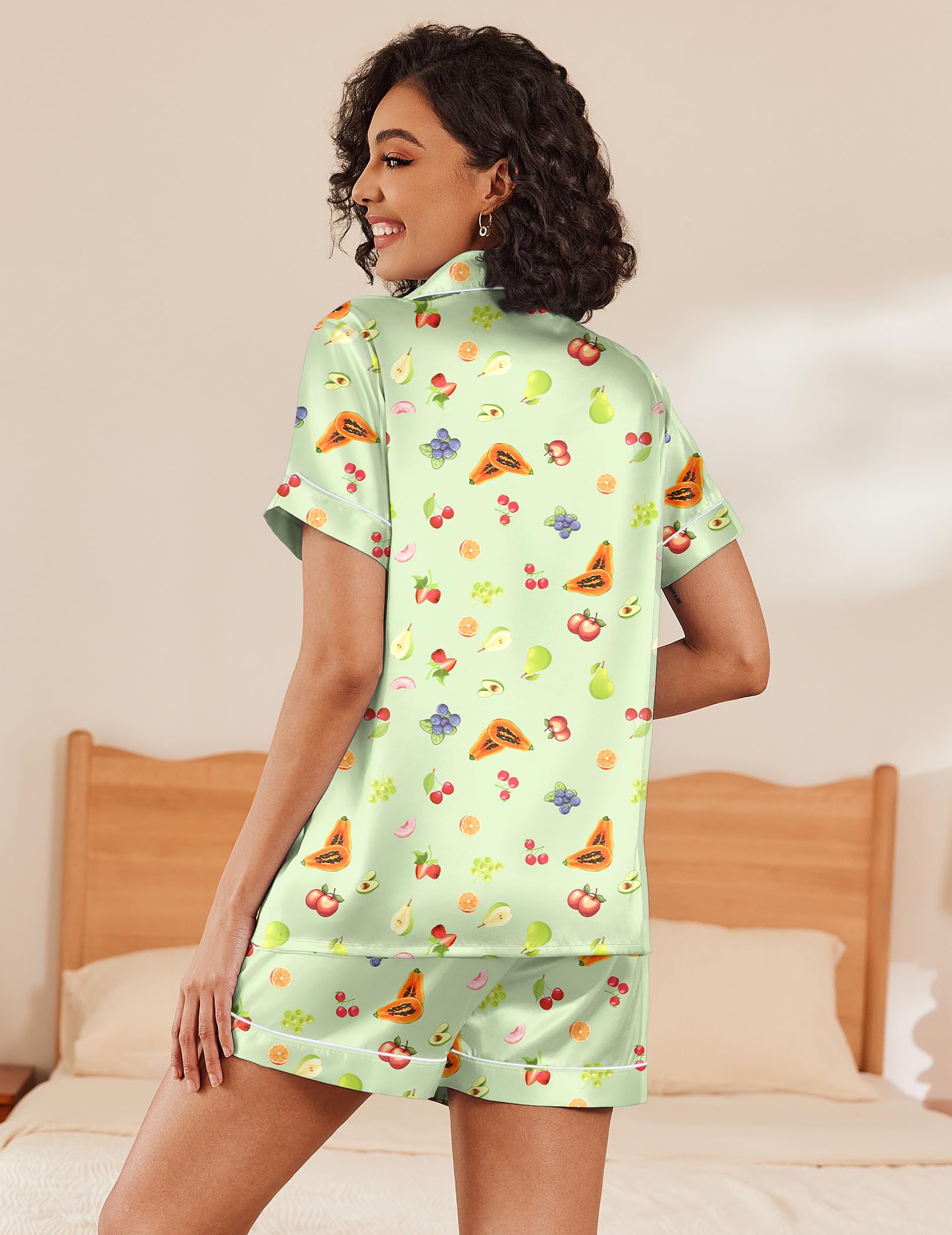 Ekouaer Satin Pajama Set for Women Comfy Short Sleeve Silk Sleepwear Button Up 2 Piece Pjs Shorts Set Bridal Gift,Green Fruit,M