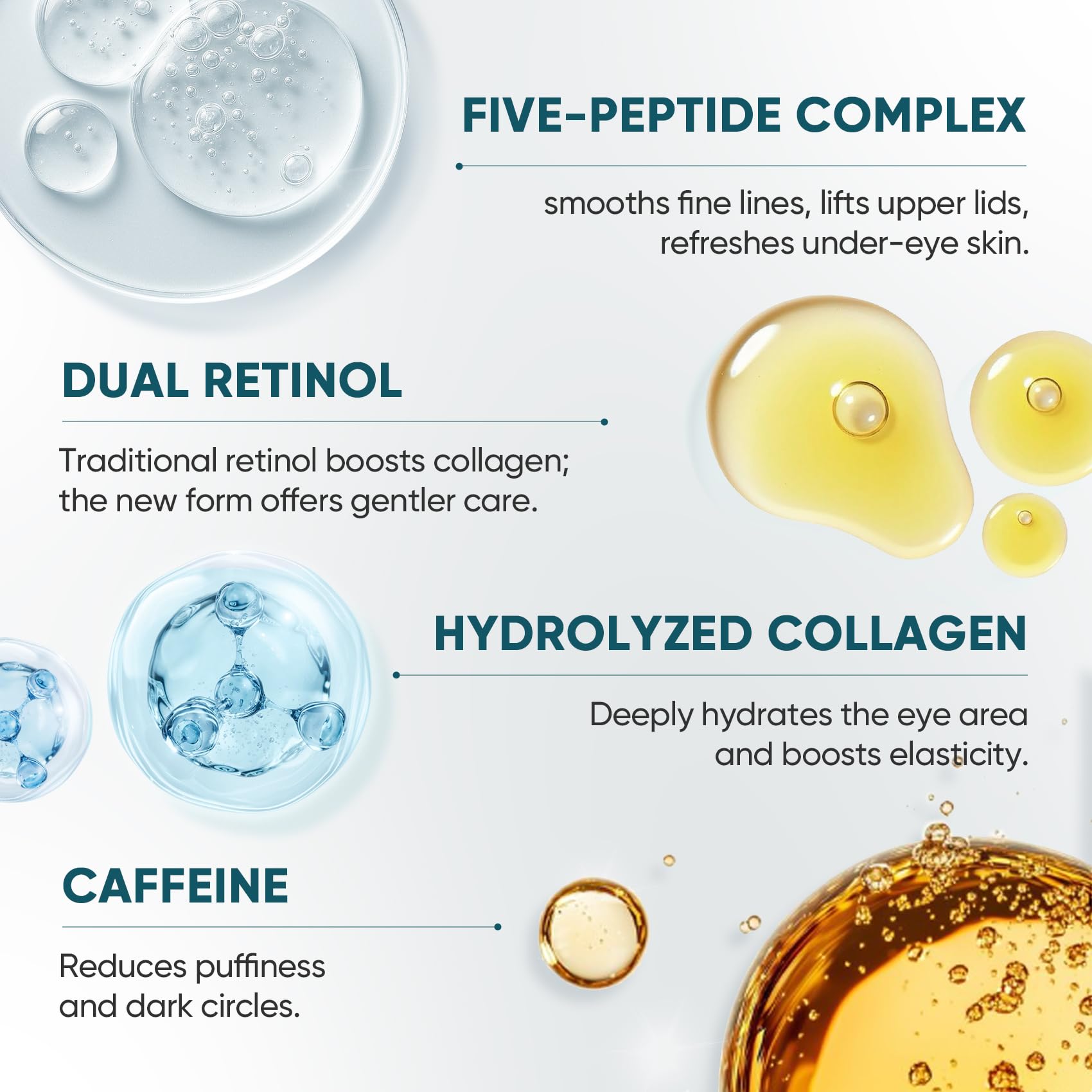 - Powerful Ingredients, Visible Results: Powered by dual retinol—classic to boost collagen and smooth visible signs of stress, and a gentle derivative to soften wrinkles—plus a 5-peptide complex to lift and firm, collagen to improve elasticity and skin density, and hyaluronic acid to hydrate. Targets early skin concerns for healthier, firmer, refreshed-looking eyes